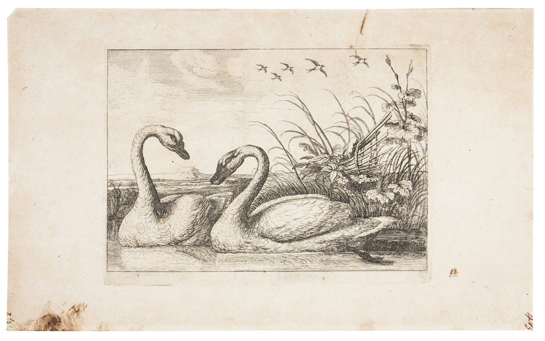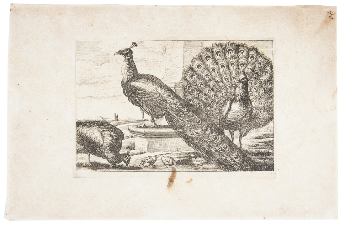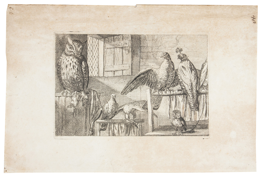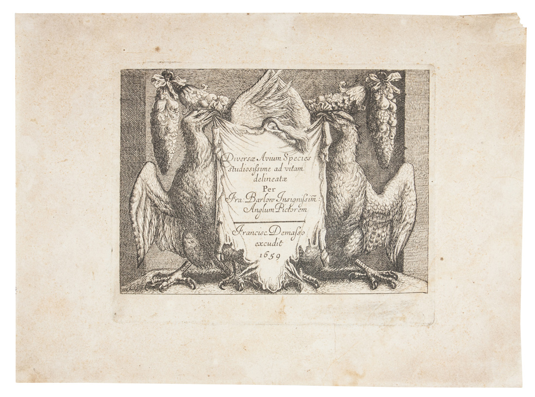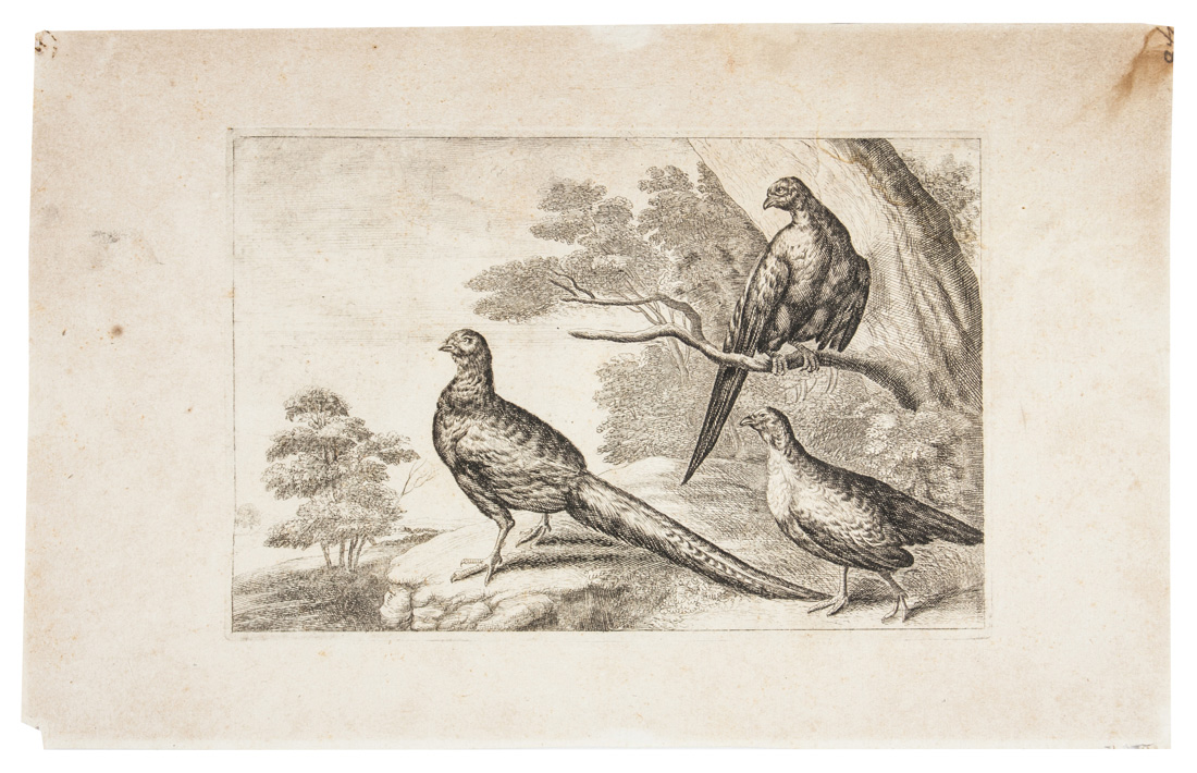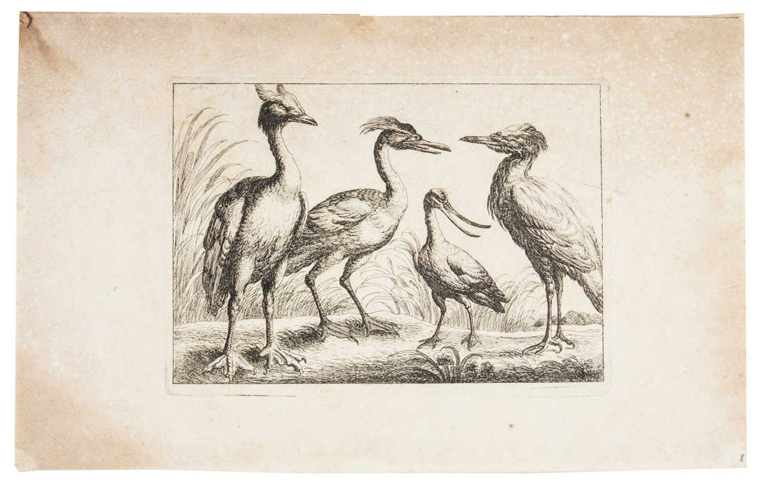 Bulino. mm 127/142x175/205. Foglio: mm 193/205x278/310. Globe, p. 32, p. 138, 516 (copy 2). NH (Hollar), 1657 e sgg. Serie in 13 tavole ed un frontespizio in controparte da invenzioni contenute nel Book of Birds del pittore inglese di uccelli ed animali Francis Barlow (c. 1626-1704), ed incise da Wenceslaus Hollar. Bellissime impressioni su sottile carta vergellata con filigrana "grappolo d'uva sormontato da piccola corona" visibile su gran parte dei fogli. (14)