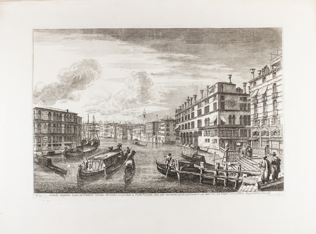 Acquaforte. mm 312x465. Foglio: mm 440x595. Succi (1983), 296. Succi (Marieschi), 14. Nel margine inferiore al centro il titolo in latino, a sinistra "N. 20" e a destra "Mich.l Marieschi del.t et inc.t". Da Magnificentiores Selectioresque Urbis Venetiarum Prospectus serie in 21 tavole pubblicata per la prima volta nel 1742. Bellissima impressione nel III stato su 4 - dopo l'aggiunta di tratti a bulino - stampata con segno nitido su carta vergellata con filigrana "tre mezzelune" e contromarca "lettere GF entro stemma".