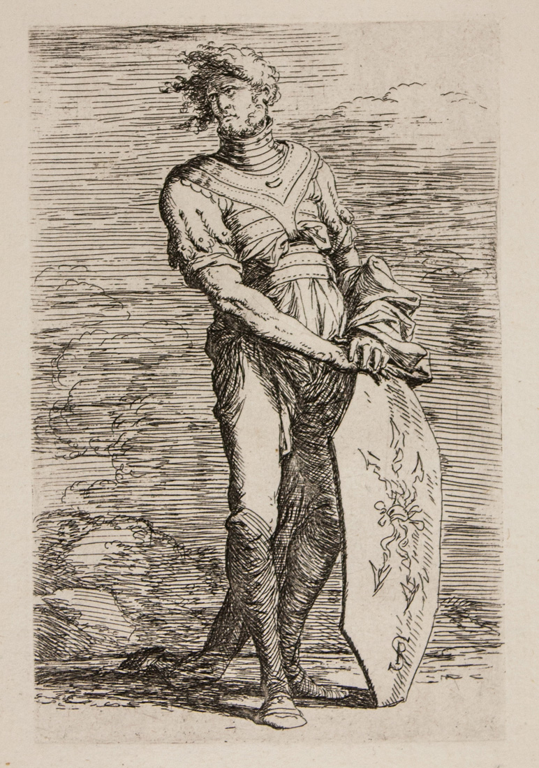 1. Soldato coi capelli al vento appoggiato ad uno scudo. Acquaforte rifinita a puntasecca.mm 147x96. Foglio: mm 278x183. Rotili, 29. Incisori napoletani, 77. Unico stato conosciuto.