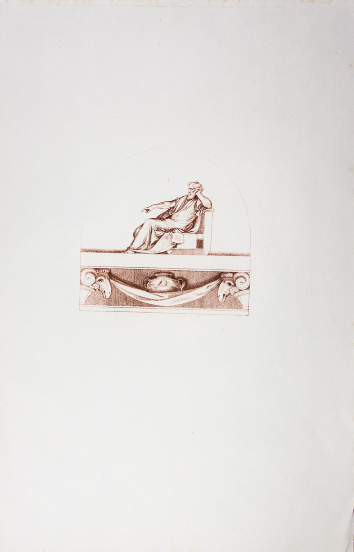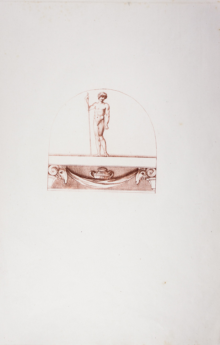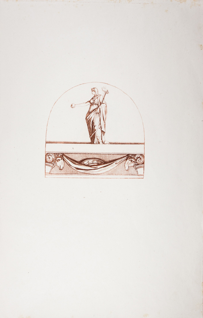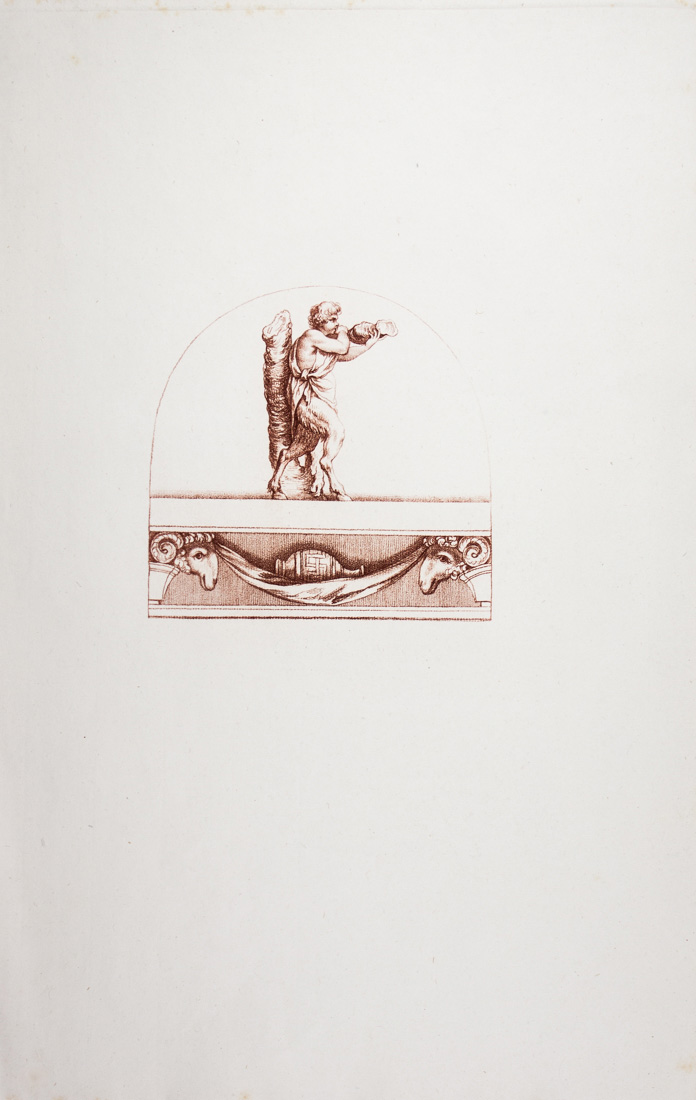 Manière de crayon con stampa in rosso scuro e bruno. Soggetto: mm 133/135x138/140. Foglio: mm 445/453x290/292. Mussini, pp. 106-113. Frontespizio e 4 tavole (La Virtù, Pan, Diana Lucifera, Saturno) da Pitture Di Antonio Allegri Detto Il Correggio Esistenti in Parma Nel Monistero Di San Paolo, edizione bodoniana Parma 1800. (5)