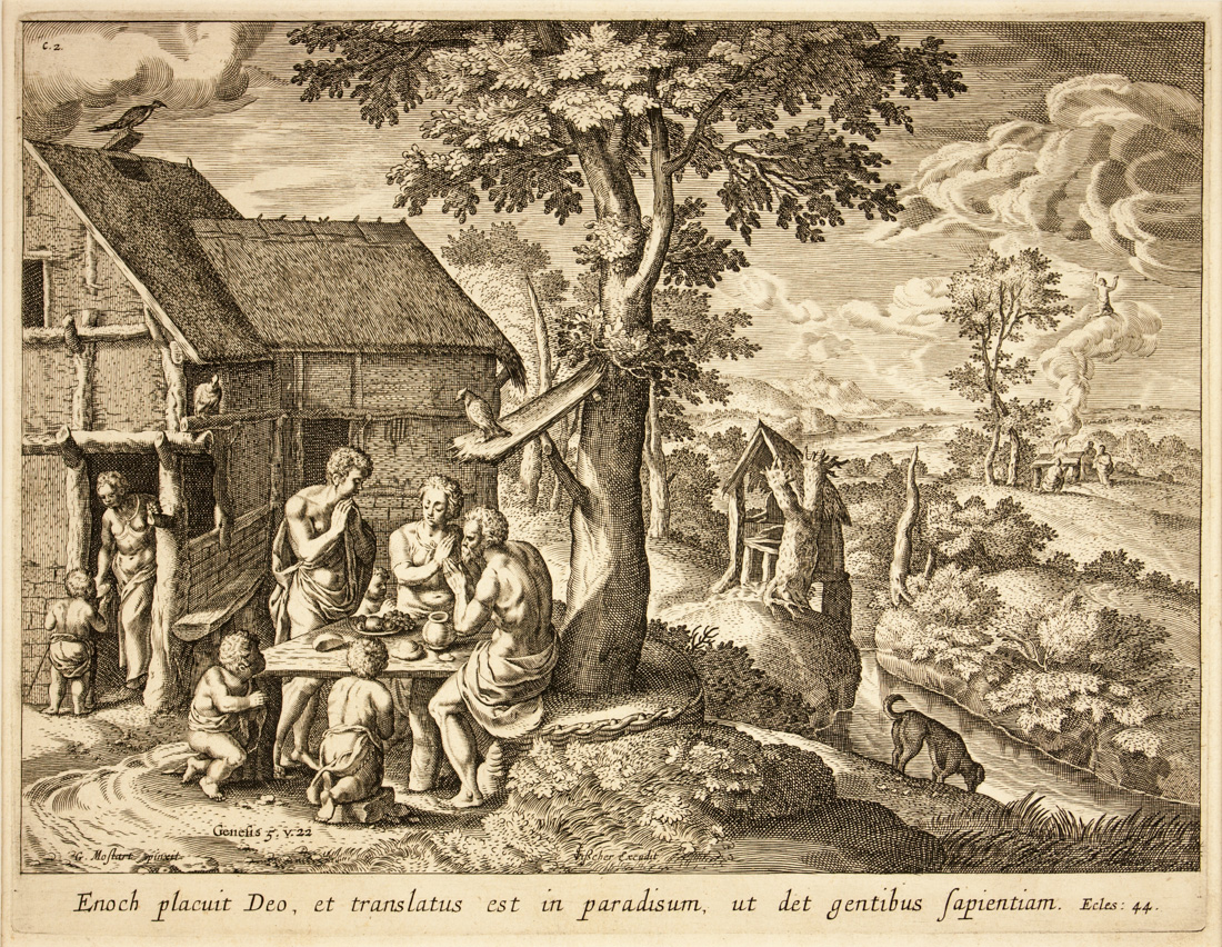 Bulino. mm 215x280. Foglio: mm 287x327. Hollstein (Dutch) XXI, 52. TIB,70 part 1, 051. Sulla lastra in basso a sinistra "Genesis 5. V.22" e al di sotto "G Mostart pinxit"; al centro "CVißcher excudit". Nel margine inferiore il verso da Ecclesiasticus 44, 16-18. Incisione in controparte da un dipinto di Gillis Mostaert (1534-1598).