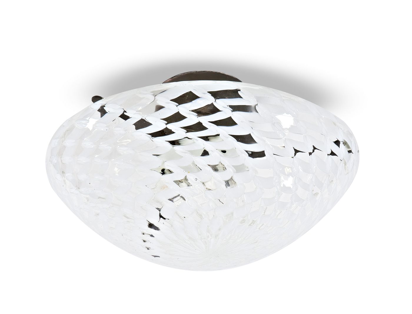 PLAFONIERA Plafoniera in vetro soffiato trasparente con nastri incrociati opalini. Montatura in metallo nichelato nero. diam cm 40