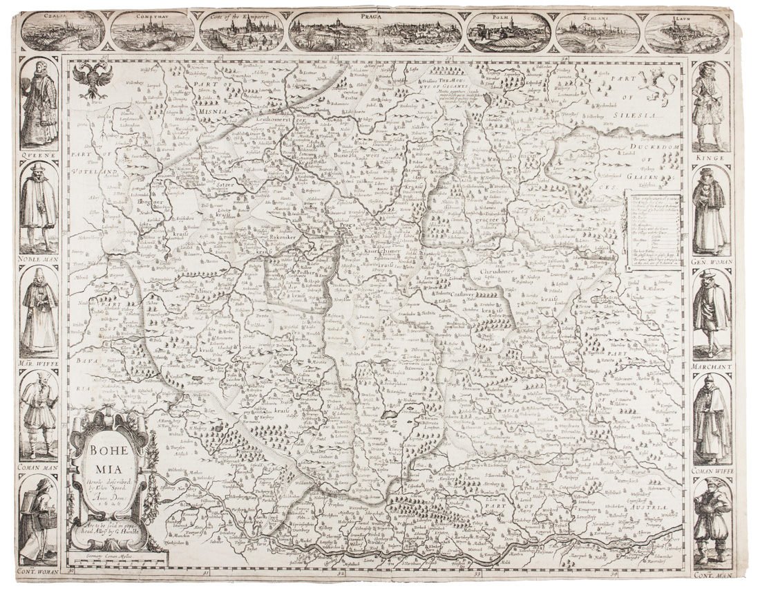Incisione in rame. mm 410x522. Titolo in basso a dinistra entro cartiglio con la dicitura stampata: "Are to be sold in popshead Alley by G. Humble". Intorno alla carta perimetro inciso composto da 17 rettangoli figurati con 7 vedute della Boemia e 10 rappresentazioni di re, regine e costumi. Testo inglese al verso. Da Prospect of the most famous part of the world (Londra, 1676).