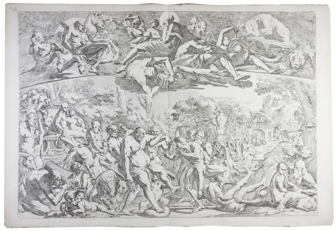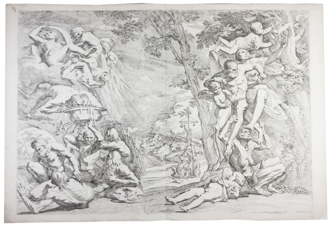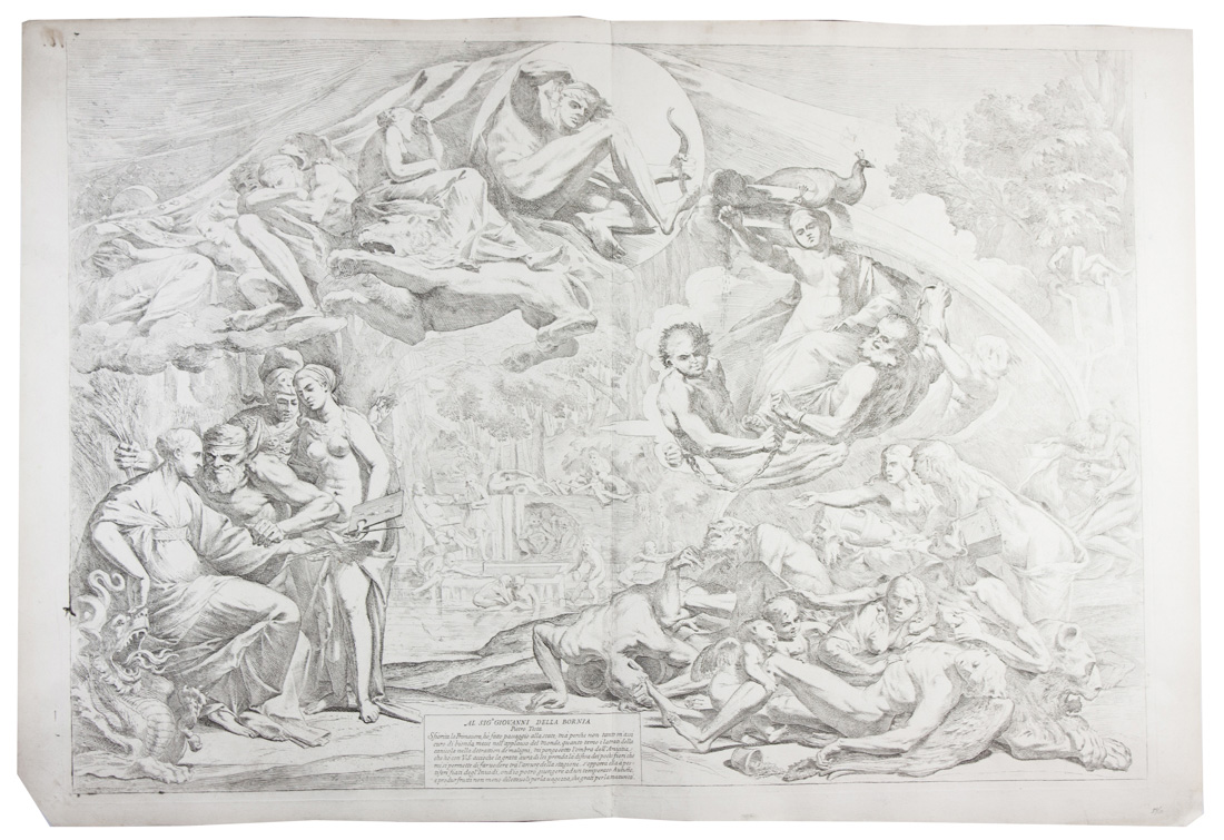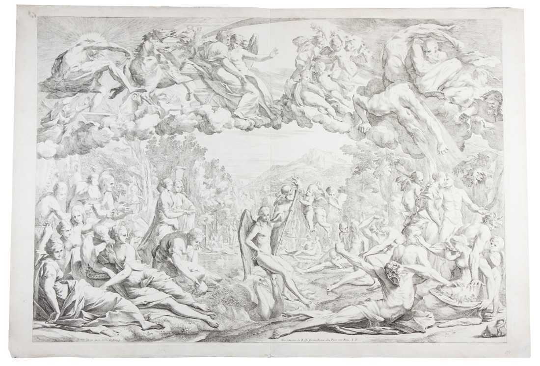 1. Allegoria dell'Inverno. Acquaforte. mm 502x720.Foglio: mm 530x780. Bartsch, 39. Bellini, 28. Cropper, 81.Firmata e datata "1644" in basso a destra. Ottima prova nel II stato su 3 secondo Bellini, con l'indirizzo di Giovan Giacomo De Rossi, e nel III stato su 3 secondo Cropper, stampata su carta vergellata pesante con filigrana "lettere P.M.". 2. Allegoria della Primavera. Acquaforte. mm 496x716.Foglio: mm 530x780. Bartsch, 36. Bellini, 30. Cropper, 75. Firmata in basso a sinistra. Ottima prova nel II stato su 2 secondo Bellini, con l'indirizzo di Giovan Giacomo De Rossi, stampata su carta vergellata pesante con filigrana "lettere P.M.". 3. Allegoria dell'Estate. Acquaforte. mm 495x715.Foglio: mm 530x780. Bartsch, 37. Bellini, 31. Cropper, 76. Buona prova nel II stato su 3, con la dedica a Giovanni della Bornia, stampata su carta vergellata pesante con filigrana "lettere P.M.".4. Allegoria dell'Autunno. Acquaforte. mm 498x720.Foglio: mm 530x780. Bartsch, 38. Bellini, 32. Cropper, 79.Ottima prova nel II stato su 2, con il tratto trasversale sul corpo di Bacco, stampata su carta vergellata pesante con filigrana "lettere P.M.". (4)