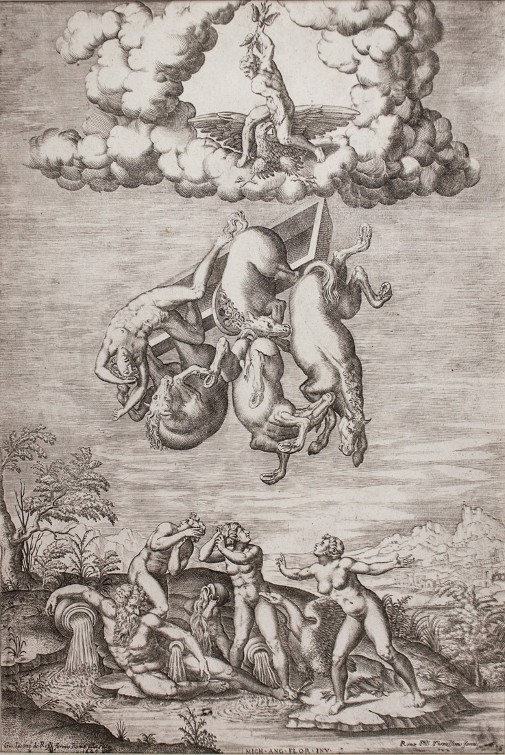 Bulino. mm 417x280. Bartsch, 38 copia. TIB, 38A(258). Nagler (Kunstler Lexicon), 60. Vallardi, p. 26. Catelli Isola/Galasso, n. 35. Bruwaert, pp. 92-93, 337. In basso da sinistra a destra "Gio:Iacomo de Rossi formis Rome alla Pace/1649", a seguire "MICH.ANG.FLOR:INV." e a destra "Romae Plls. Thomassinus formis". Copia nello stesso verso dall'incisione che il Beatricetto trasse dalla terza versione di questo soggetto disegnata da Michelangelo per Tommaso de Cavalieri attorno al 1533 e oggi alla Royal Library di Windsor (inv. 12766). Secondo il Bruwaert, Thomassin intagliò la lastra nel 1618 all'età di 56 anni. Ottima prova nell'unico stato su carta vergata con filigrana "fiore di giglio in doppio cerchio".
