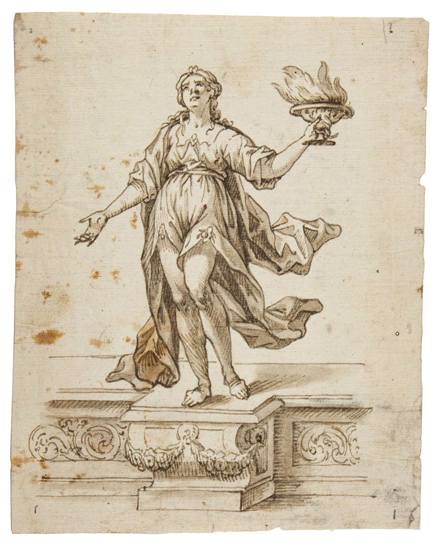 Penna e acquerello bruno, pennello e acquerello seppia, su carta vergellata avorio con filigrana "aquila" (Carta italiana fine XVI). mm 220x175. Studio per figura allegorica forse complemento per impianto architettonico in una composizione più estesa. Come attributo della Carità, qui rappresentata senza il bambino al seno, sarebbe da leggere solo la coppa con la fiamma simbolo dell'amore ardente verso il prossimo.