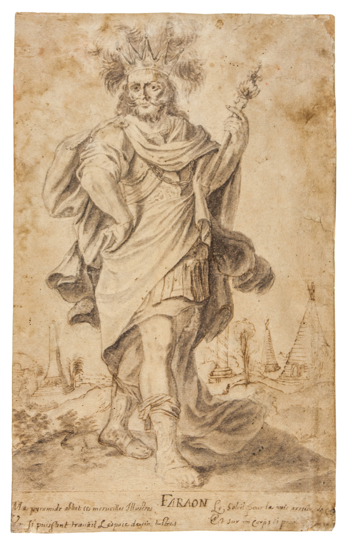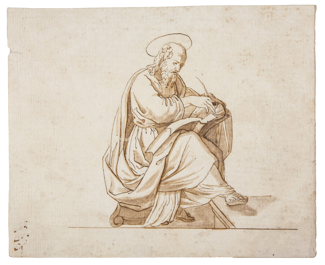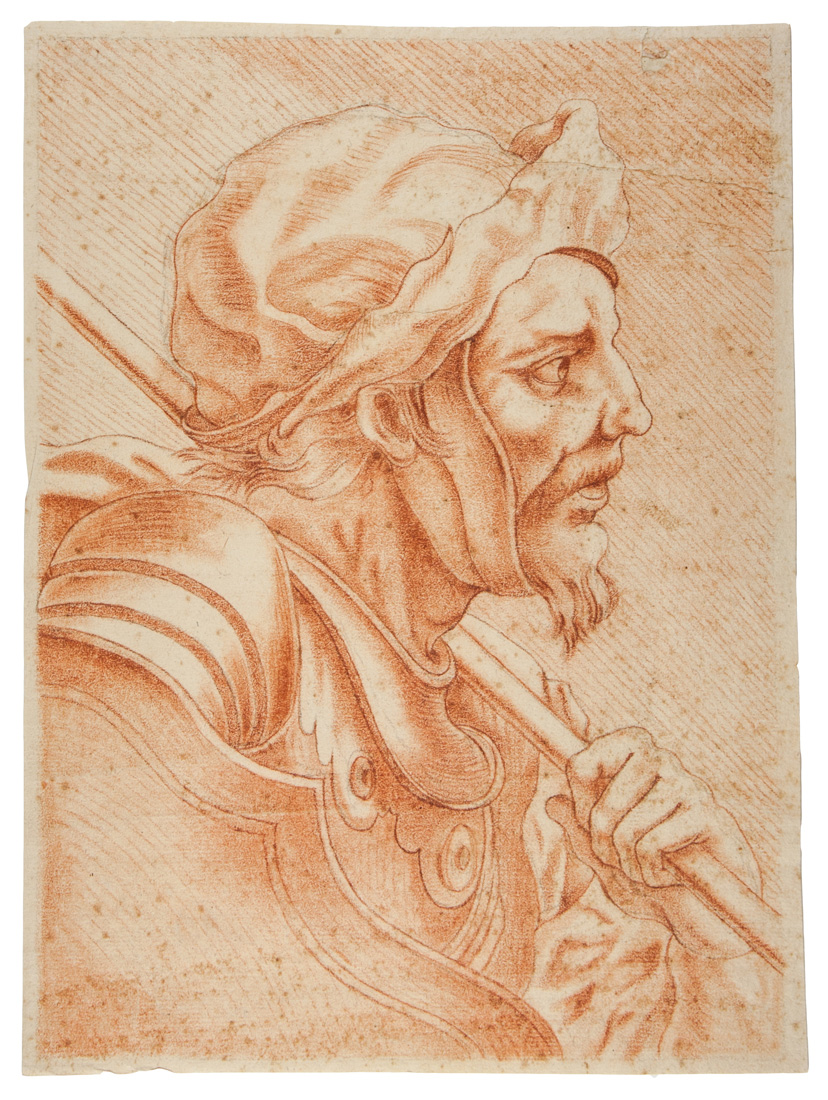 Studio per armigero. Matita rossa su tracce di matita di grafite. Carta vergellata beige priva di filigrana. mm 305x225. Al verso timbro di collezione ad inchiostro violetto "iniziali E.G sormontate da corona". SI AGGIUNGE: Id. Faraone. Penna e inchiostro bruno, pennello e acquerello grigio, tracce di matita nera. mm 340x210. Probabile copia da incisione. SI AGGIUNGE: Id. Studio per evangelista. Penna e inchiostro bruno, pennello e acquerello seppia. mm 170x208. Al verso notazione inventariale "398" a penna e inchiostro bruno.(3)