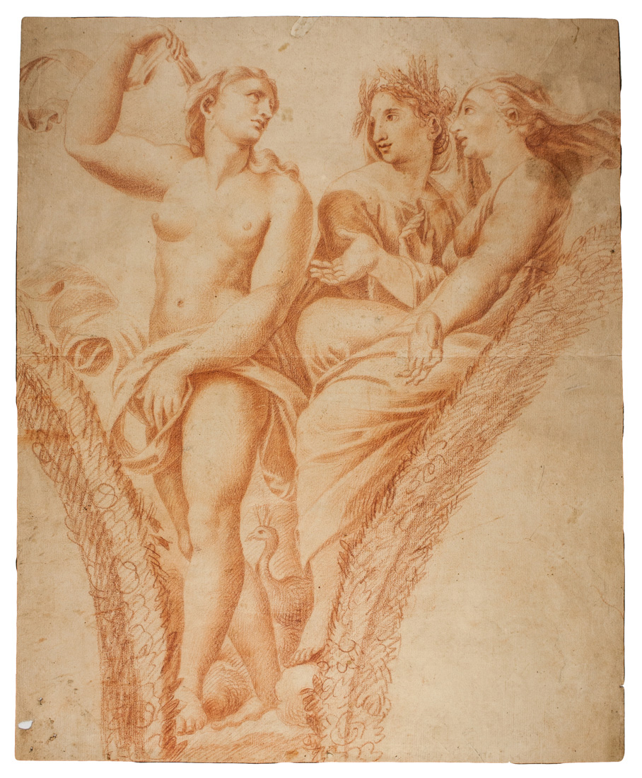 Matita rossa su carta vergellata beige con filigrana "lettera H e croce latina entro ovale". mm 495x400. Soggetto tratto dall'affresco di medesimo soggetto eseguito dalla scuola di Raffaello nella loggia di Psiche alla Farnesina, ovvero dalla serie incisa ad opera di Nicolas Dorigny (Parigi 1658 - 1746) ed edita nel 1693.