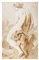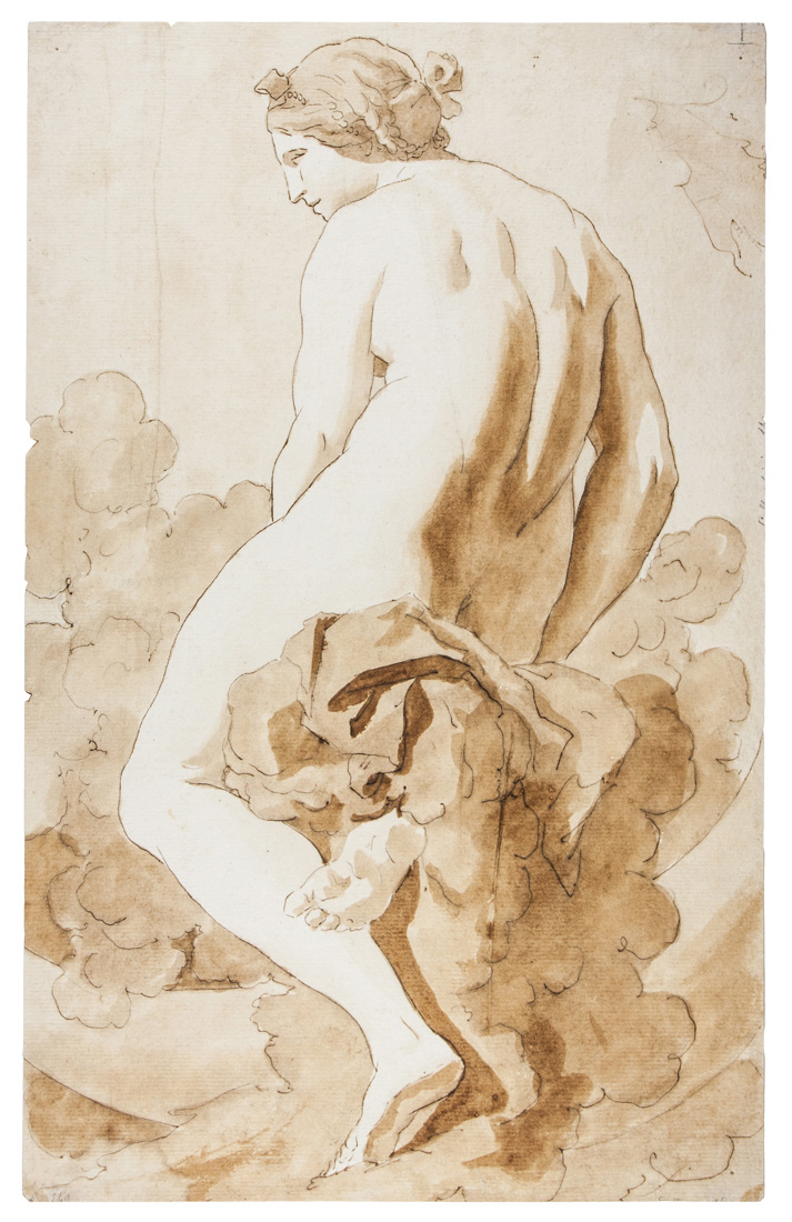 Penna e inchiostro bruno, pennello e acquerello seppia, su carta vergellata pesante con filigrana "grande stemma". mm 410x258. Al verso antica etichetta cartacea con il numero d'inventario "289" e timbro di collezione a inchiostro violetto "iniziali E.G. sormontate da corona"; poi la scritta "1700 Bello Coll. Cantoni e me" a matita di grafite. L'invenzione sembra richiamare liberamente la figura della Grazia seduta con le spalle all'osservatore nel pennacchio della loggia di Psiche alla Farnesina con Amore che indica Psiche alle Grazie; esempio per molti artisti che si ispirarono a Raffaello, compreso Jean-Dominique Ingres che ne offre testimonianza nella Grande bagnante (1808) dipinta a Roma durante il suo soggiorno come Prix de Rome.