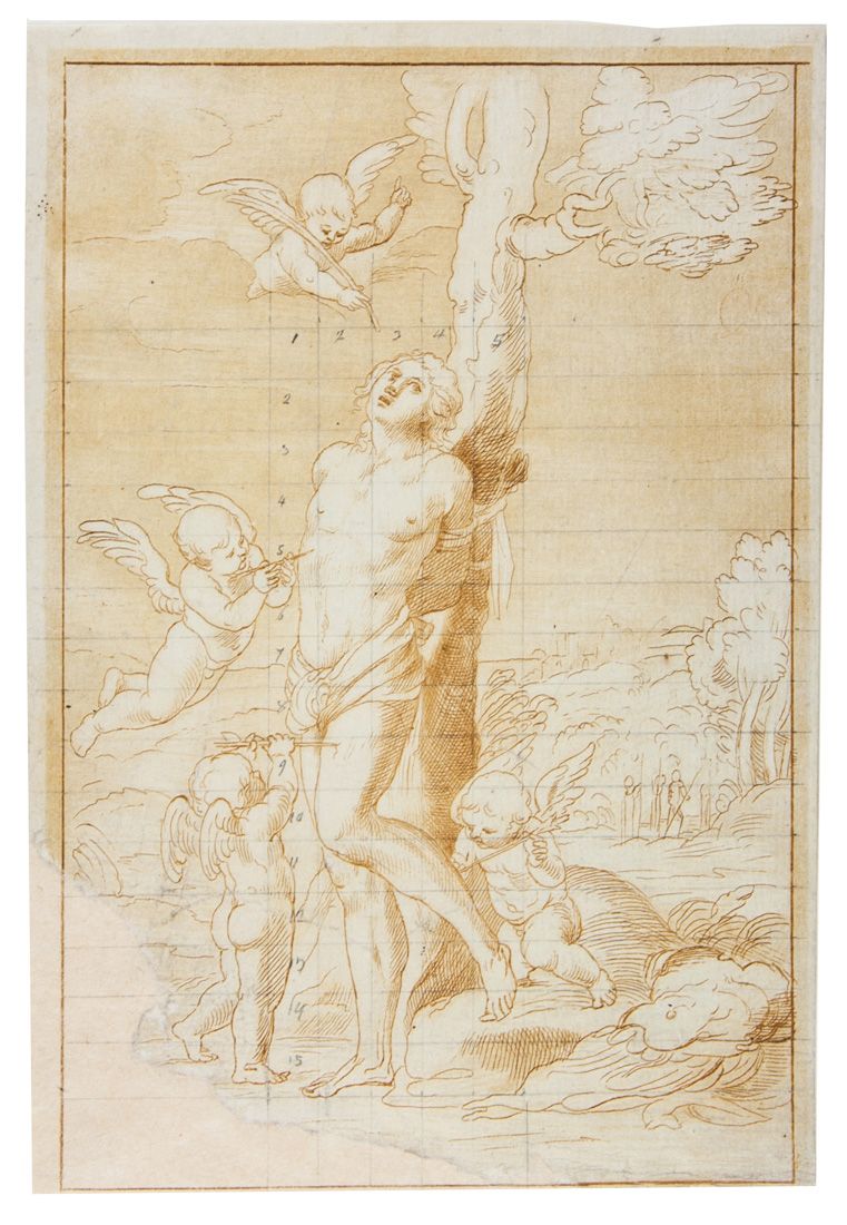 Penna e inchiostro bruno chiaro su carta vergata. mm 245x168. Probabile preparatorio per incisione (si veda per confronto stilistico Cristoforo Silvestrini, Roma 1750-1813 ?, San Sebastiano, The British Museum inv. 1856,0308.436).