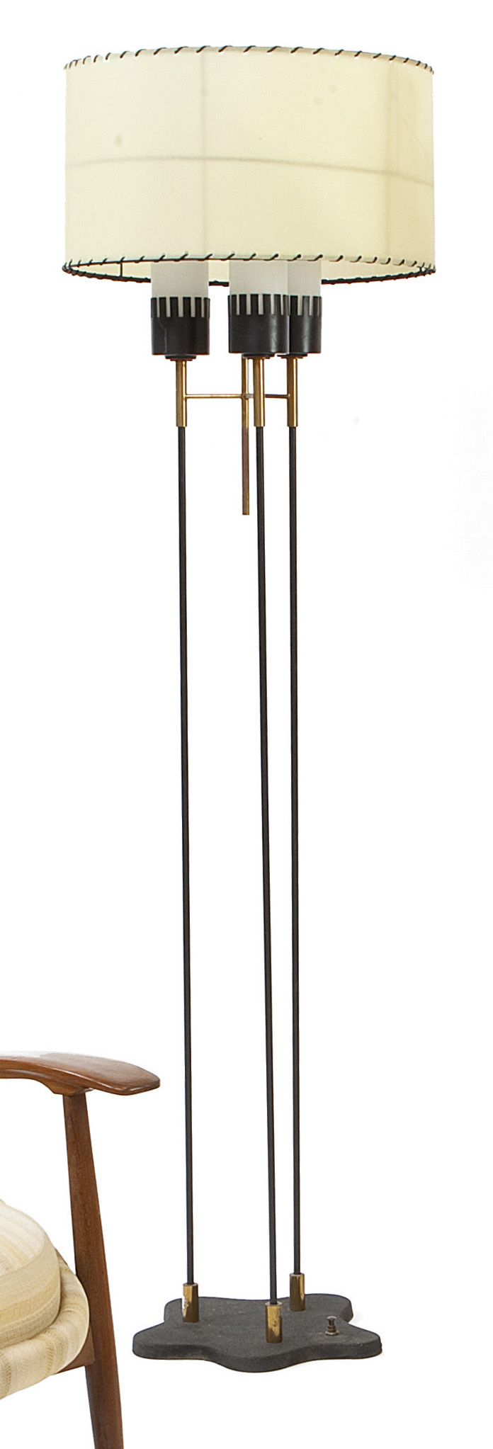 LAMPADA Lampada da terra a tre luci con base in fusione metallica e steli laccati neri. Elementi in metallo zapponato, paralume in carta pergamena. 1955 circa. h cm 170