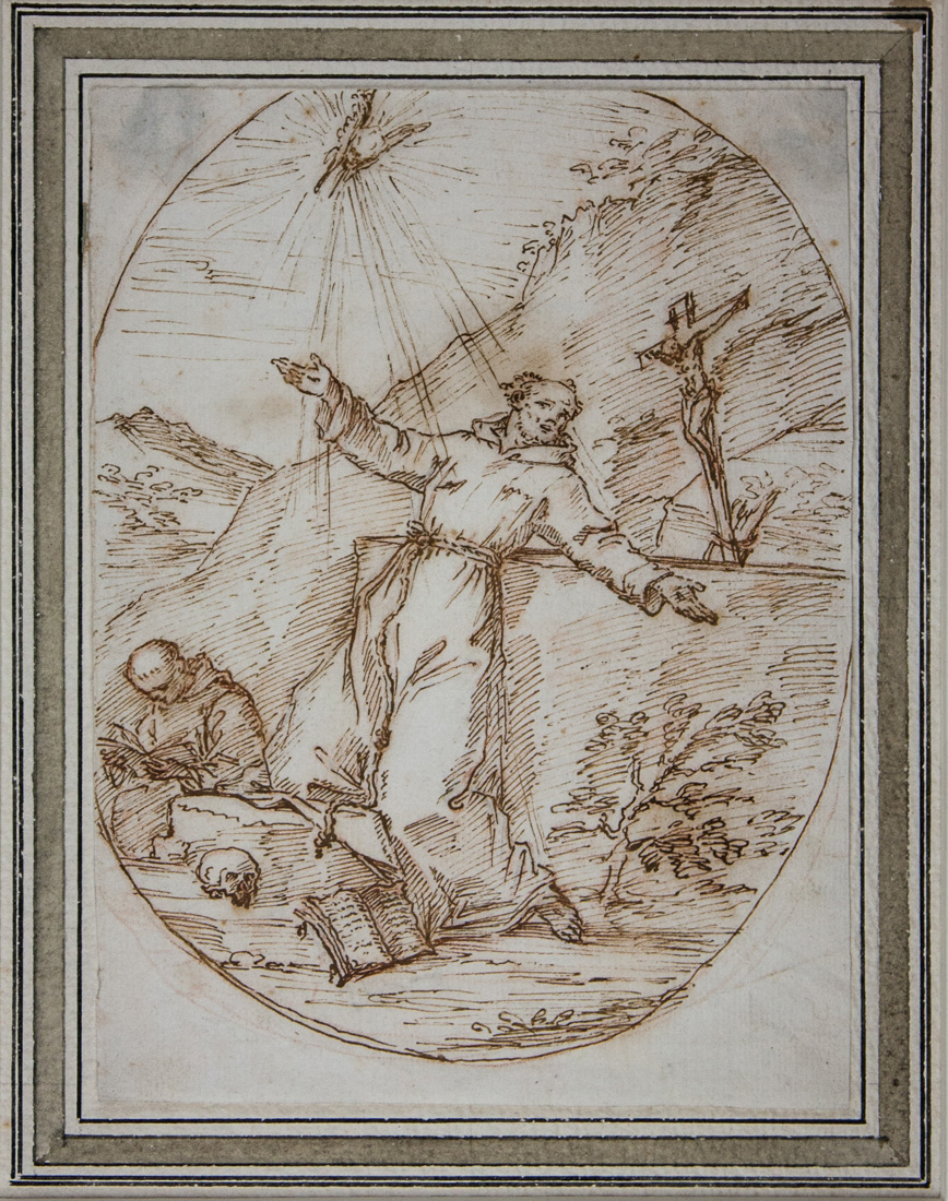 Penna e inchiostro bruno su tracce di matita rossa. Carta vergellata bianca con frammento di filigrana "freccia". mm 187x140. Cellini, pp. 20-21. Graziani, n. 9. Bigucci, pp. 42-43, figg. 16-17. Il disegno è in relazione ad un dipinto in ovale rammentato dallo Zanotti come San Francesco ricevente le stimate commissionato dal marchese Muzio Spada (1661-1710) a Giovan Gioseffo Dal Sole. Notizia poi riportata anche da Oretti. L'opera era stata attribuita inizialmente alla maniera più prossima di Giovan Giuseppe Dal Sole (O. Piraccini (a cura di), Il patrimonio culturale della Provincia di Forlì, I, Bologna 1974, 84) poi al suo allievo di origine veronese, Felice Torelli (1667-1748) da Marina Cellini. In base ai recenti ritrovamenti documentari di Monia Bigucci ed all'intervento di restauro del dipinto si può pensare a un riesame diretto dell'opera e all'ipotesi che il dipinto sia piuttosto da attribuire al maestro bolognese anziché al suo allievo, assegnando a lui anche il disegno in esame che sembra costituirne il preparatorio.  G. Zanotti, Giovan Gioseffo Dal Sole, in Id., Storia dell'Accademia Clementina di Bologna, I, per Lelio della Volpe, Bologna 1739, pp. 289-316, 305.   72 Cfr. M. Oretti, Le pitture che si vedono nelle Case e' Palazzi de Nobili della Città di Bologna, BCABo, sec. XVIII, ms. B 104, II, cc. 54-55, 55.
