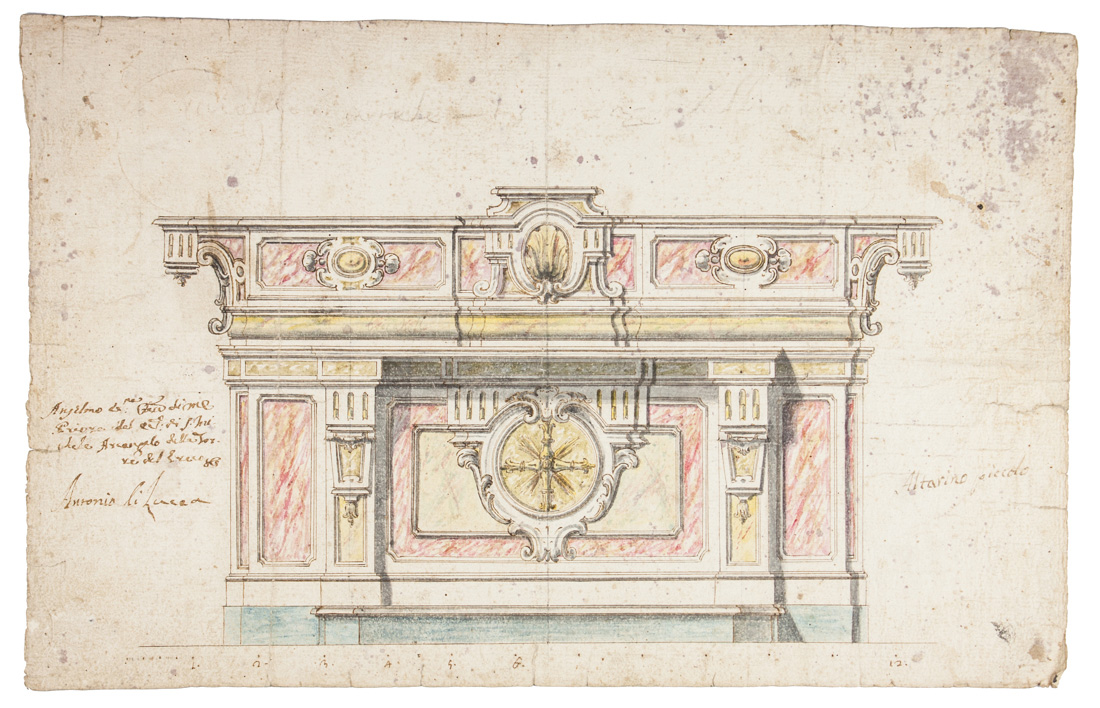 Penna e inchiostro bruno, pennello e acquerello giallo, rosso, azzurro e grigio. mm 252x390. Carta vergellata pesante con parte di filigrana in cerchio singolo non identificabile. A destra si legge "Anselmo da: [...]di me/Priore del [...]di S. Mi/chele Arcangelo della Tor/re del Greco [...]/Antonio di Lucca" e a sinistra "Altarino piccolo", a penna in antica grafia. Antonio Di Lucca fu scultore e marmoraro assai noto nella Napoli del XVIII secolo, dove svolse un'intensa attività spesso in collaborazione con architetti di fama:  con il Vanvitelli e Mario Gioffredo eseguì il più sontuoso rivestimento marmoreo di tutto il Settecento napoletano, la crociera e la navata dei Ss. Marcellino e Festo.