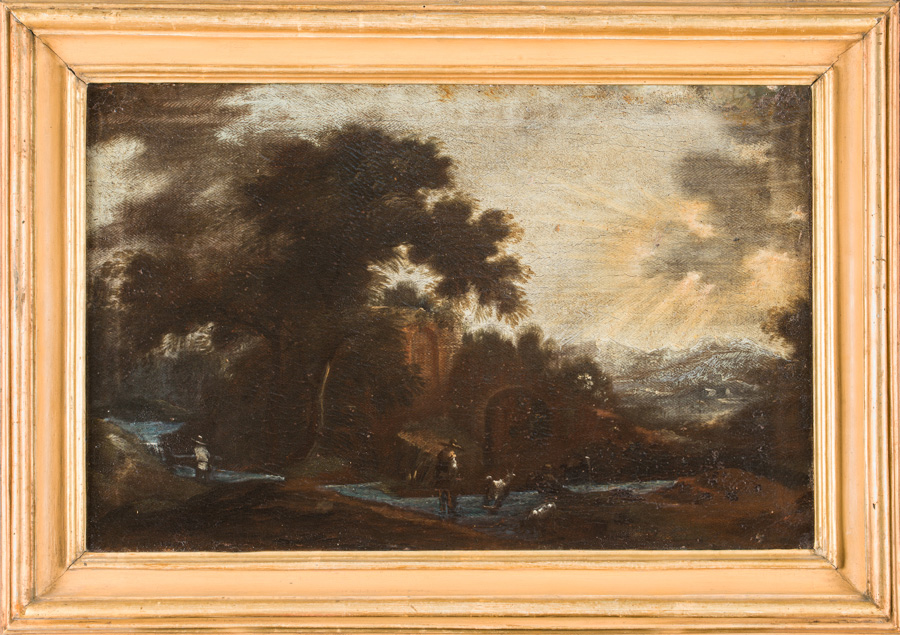 Anonimo del XVIII secoloPaesaggio fluviale con cascatella, pescatori e capre....
