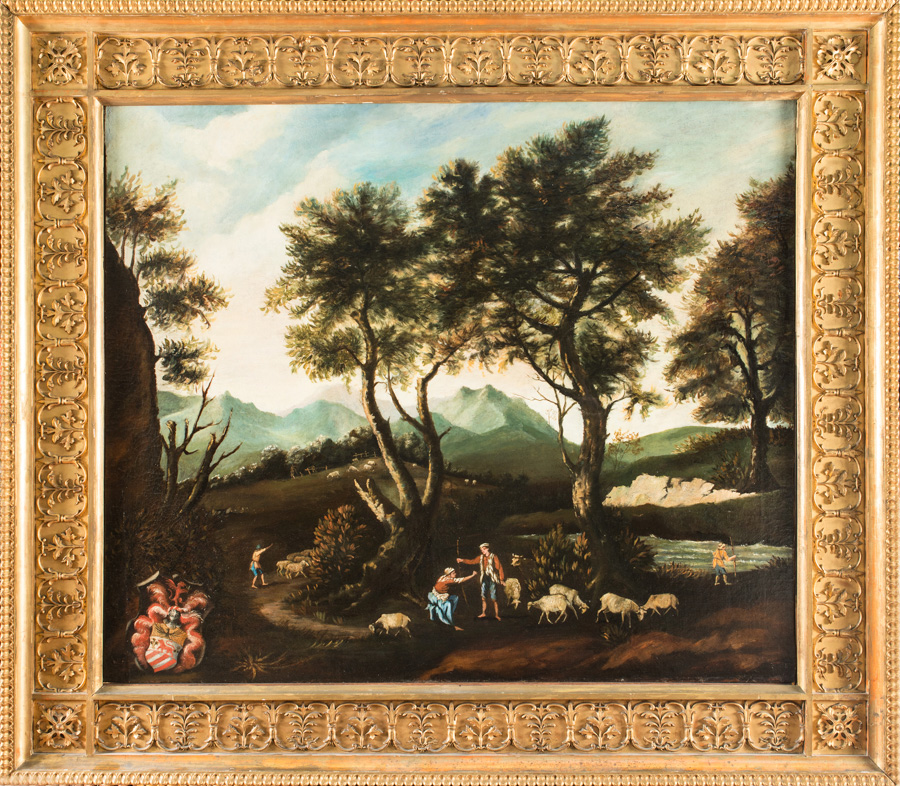 Olio su tela. cm 109x128. Questo grande paesaggio con montagne sullo sfondo raffigura probabilmente una veduta della Valtellina commissionata dalla nobile famiglia Omodei della quale nella tela compare il blasone in basso a sinistra ad indizio anche di una eventuale provenienza. Gli Omodei originari di Bellagio, si trasferirono a Tirano all'inizio del XIII secolo e vengono ricordati nel paese di Sernio dall'anno 1377.