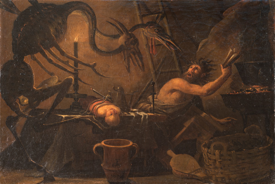 Olio su tela. cm 46x68. Siglato "FGS" e datato "1674" sull'orcio al centro. La scena - con la creatura mostruosa evocata dal rito malefico, lo stregone atterrito che fugge, ed il bambino inconsapevole destinato al sacrificio ancora legato - dichiara tutto il suo debito nei confronti dei quadri di magia e di stregoneria dipinti da Salvator Rosa nel suo periodo fiorentino (dall'autunno del 1639 al 1650), ed ambitissimi dagli amatori. La stregoneria a Firenze aveva trovato nella seconda metà del XVII secolo grande diffusione, in seguito alla pubblicazione del Corpus Hermeticum ed il collezionismo per questo tipo di soggetti magico-stregoneschi era divenuto comune ad alcuni nobili legati alla casata Medici, ad esempio il marchese Corsini, destinatario della celebre Stregoneria Corsini; i dipinti a tematica stregonesca-magica, le cosiddette Magherie o Incatesimi, erano infatti opere per un pubblico elitario di collezionisti, di fruizione privata, tenute segrete e mostrate solo ad una cerchia ristretta di amici.