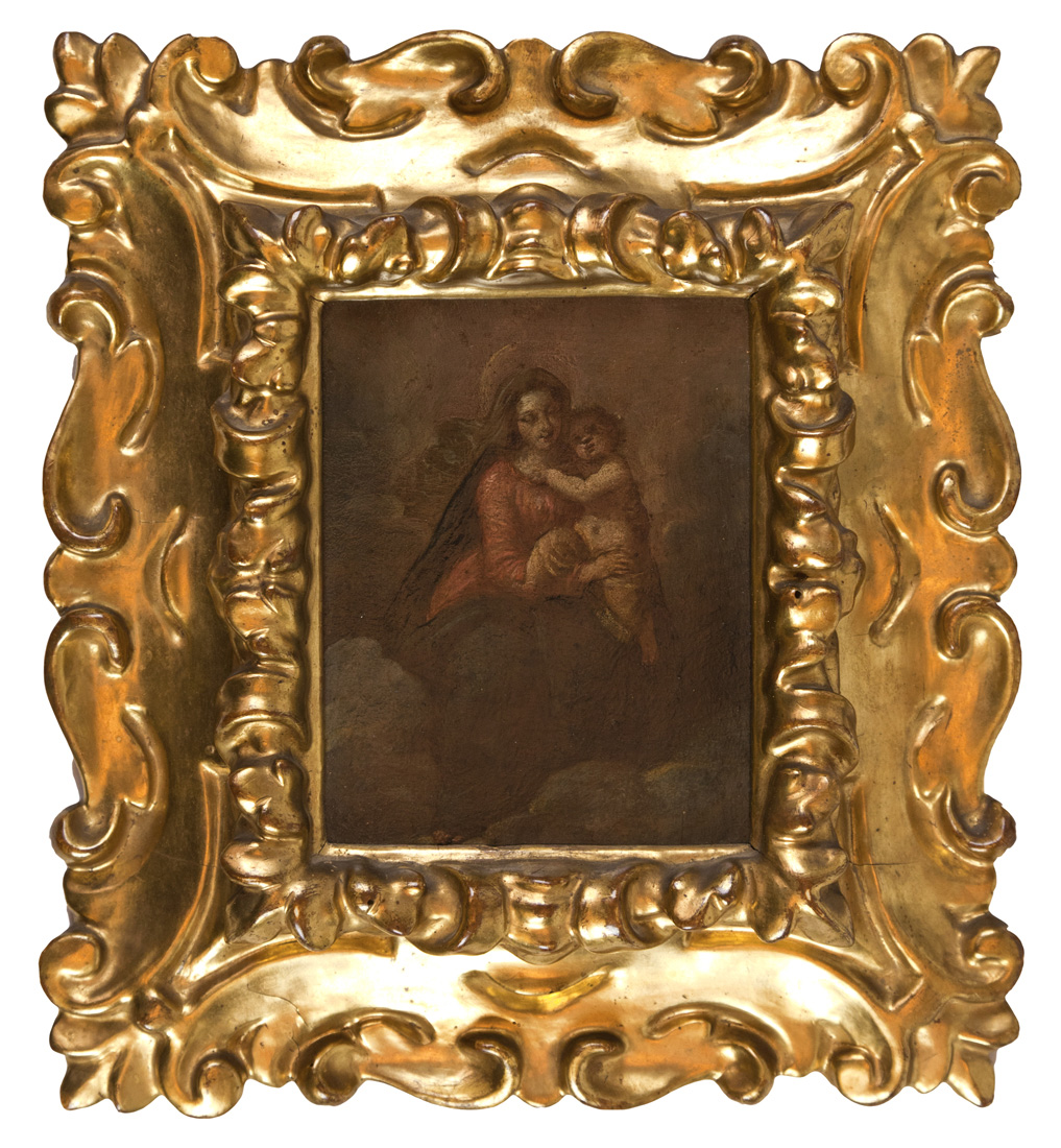 Olio su rame. cm 15x12. Figlio di Sigismondo Scarsella, anche lui pittore, si deve al padre l'aver sospinto il giovane alla futura professione. Non è certa una prima visita a Bologna mentre si ricorda un tirocinio nella bottega del Veronese, operante a Venezia, dove il giovane Ippolito assimila lo stile manieristico e la lezione tizianesca. Tornato a Ferrara inizia ad operare in proprio ed apre una sua bottega. Alla prima maturità può esser fatta risalire l'influenza dei Carracci, riscontrabile nell'intimo tono devozionale dei dipinti sacri. Il suo percorso artistico comprende, oltre a numerose grandi pale d'altare per chiese ferraresi, anche una copiosa produzione di dipinti di piccolo formato, a soggetto sacro o profano, per la devozione o il gusto privato di una committenza scelta. A quest'ultima produzione sembra appartenere anche il piccolo rame in esame, dove la componente veneta sembra far largo all'affettività spiegata di marca carraccesca. Il dipinto è accompagnato da una lettera di Mina Gregori che ne conferma l'attribuzione e ne analizza la cifra: “I confronti con le opere note fanno datare questo prezioso quadretto prima del 1580, nella fase giovanile. Vi sono evidenti i punti di riferimento della cultura di formazione del pittore, Paolo Veronese, riecheggiato nell'intonazione dei colori, e il Parmigianino nell'articolazione formale del Bambino. E' interessante notare che un'iscrizione nel verso della fine del Settecento o degli inizi dell'Ottocento attribuiva già il quadro allo Scarsellino”.
