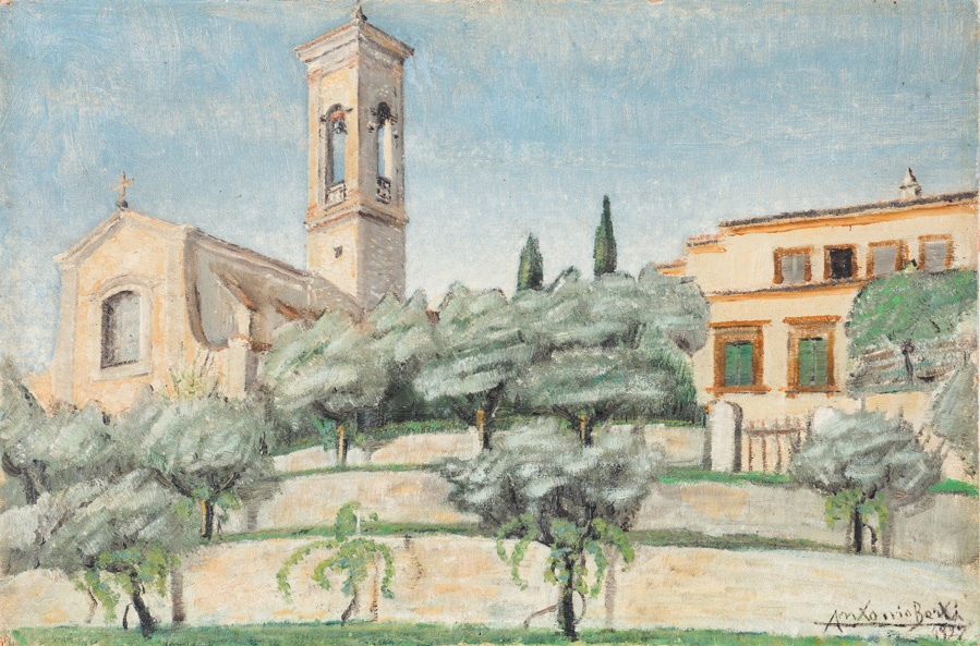 Lotto 218 | Antonio Berti Veduta di paese con chiesa.1927Olio su cartone. cm 29,8x44,5....