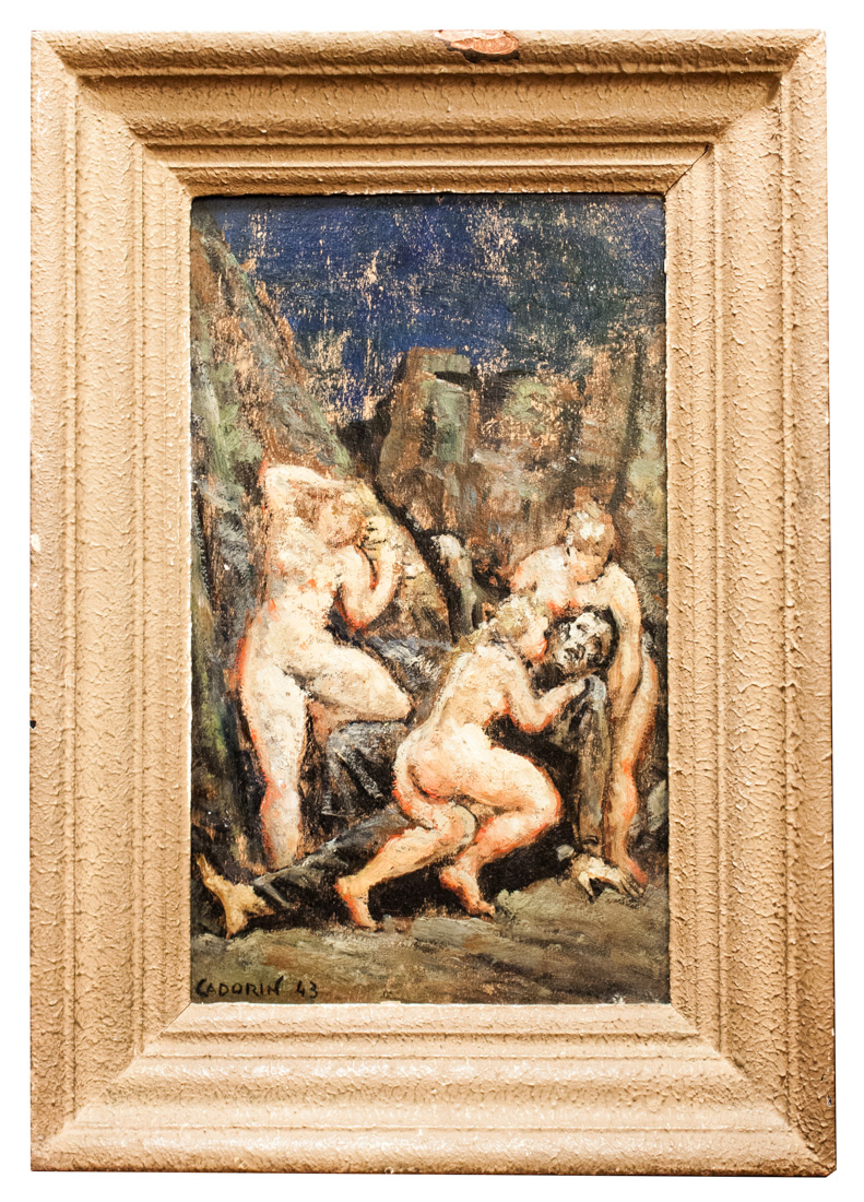 Guido Cadorin Uomo disteso e tre figure femminili nude.1943Olio su tavola. cm...