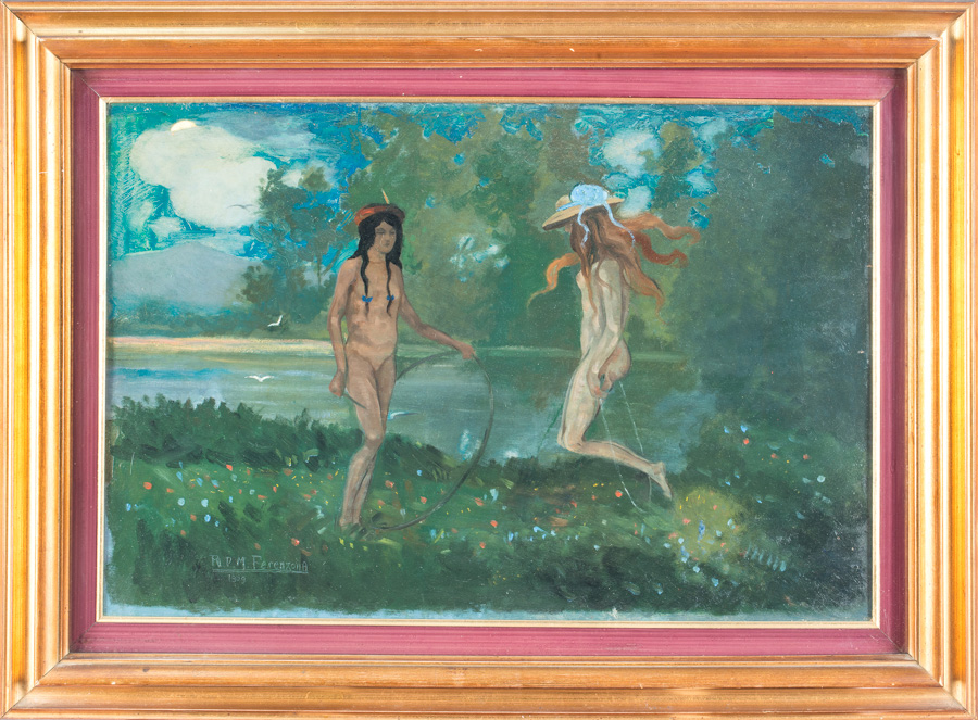 Olio su tavola. cm 37,5x55. Una delle due figure femminili ripete il motivo dell'incisione Il cerchio del 1909 (Quesada 1978, n. 92). Firmato e datato in basso a sinistra.