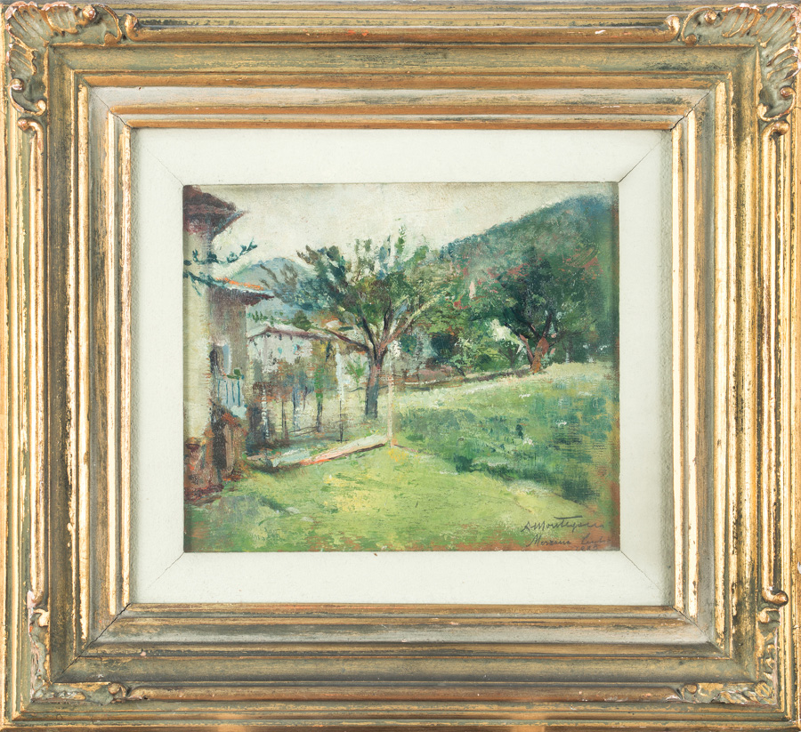 Olio su tavola. cm 20x23,5. Firmato e datato in basso a destra: "A. Montegani Merzana luglio 1935". Al verso cartellino personale della galleria Ranzini, Milano, 1947.