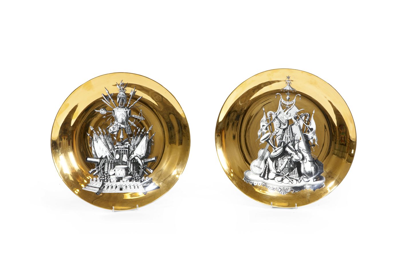 FORNASETTI PIERO Due piatti serigrafati con decori della serie "Panoplie", es. n 5/6 e n. 6/6, fondo in oro, anni '50, su porcellana Richard Ginori Marchiati "Fornasetti- Milano, Made in Italy Panoplie" e simboli grafici Particolare edizione dal diam di cm 34 Bibl.: B. Fornasetti ( a cura di), "Fornasetti. La bottega fantastica", Electa, 2009, pag. 617, fig.141