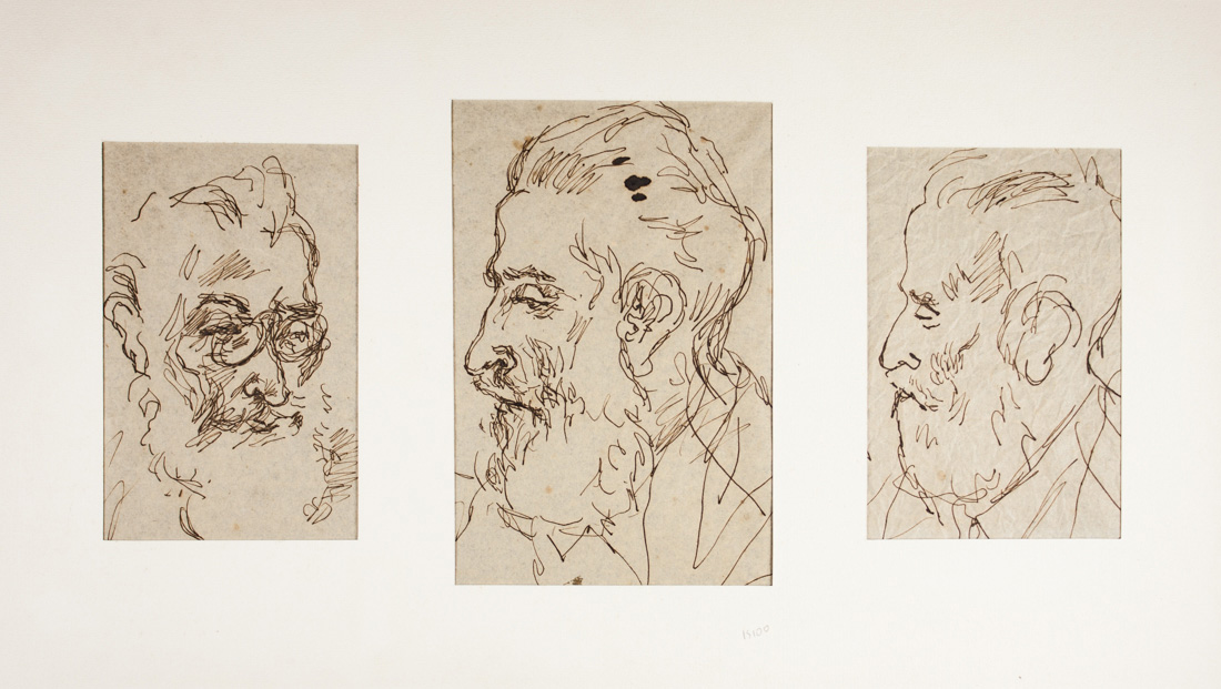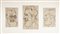 Penna e inchiostro di china su carta. Tre disegni montati con scotch su un unico passepartout, da sinistra a destra: mm 230x155, 260x190, 215x155.
