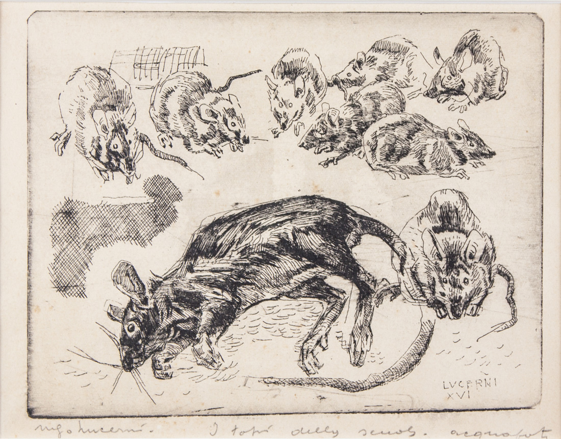 Si aggiunge: Ugo Lucerni. I topi della scuola. 1937-38. Acquaforte. mm 120x160. Foglio: mm 231x275. Firmata e datata nella lastra in basso a destra: "Lucerni XVI". (2)