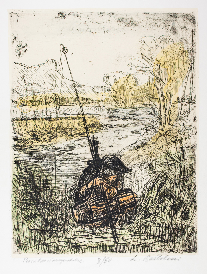 Luigi Bartolini Pescatore d'acqua dolce.1936Acquaforte colorata. mm 320x245....