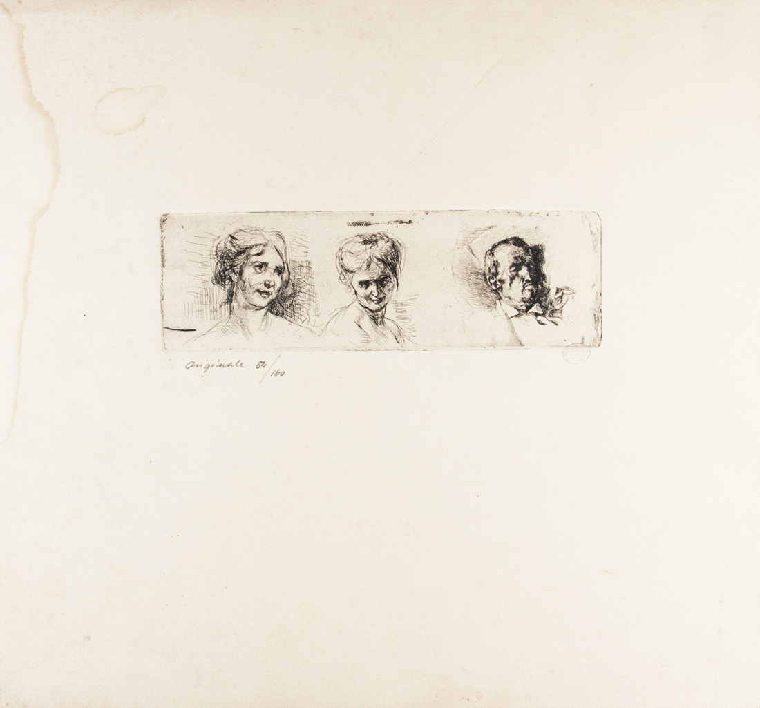 1) Studio inedito. Acquaforte. mm 68x215. 345x375. A matita in basso a sinistra: "Originale. 84/160". Timbro della Calcografia Fusetti di Luigi De Tullio in basso a destra. Tirata in occasione della mostra dell'opera grafica di Mosè Bianchi alla "Saletta d'Arte Dantesca", Torino 1963 come riportato a stampa sul retro. 2) Maschera. Acquaforte e acquatinta. mm 240x175. Foglio: 410x280. Numerata a matita 95/160. Tiratura Fusetti, come sopra. (2)