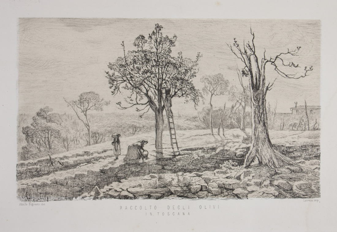 Adolfo Bignami Raccolto degli ulivi in Toscana.Post 1869.Acquaforte. mm...