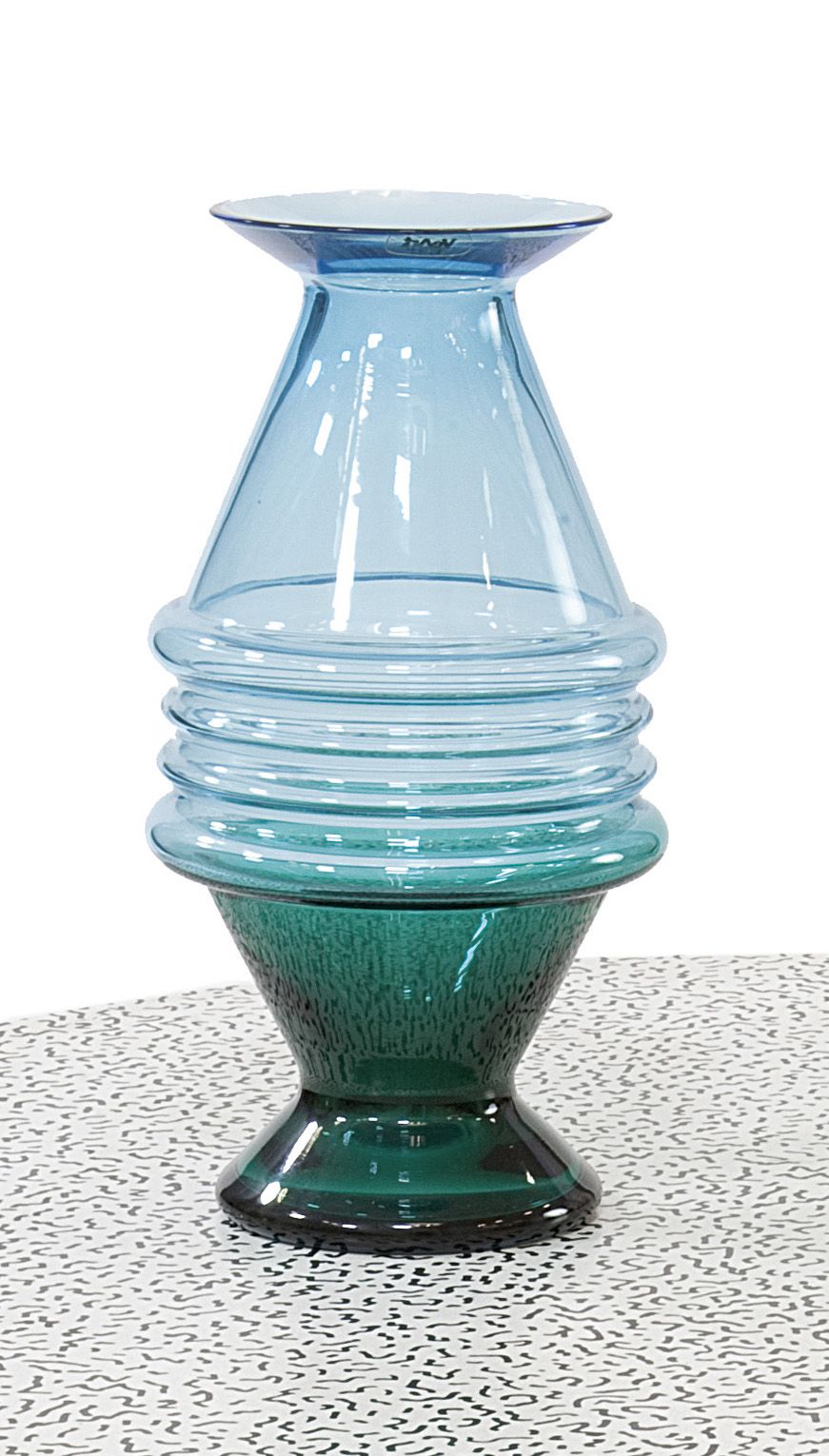 RAFFAELLI LUISA Saturno Vaso in vetro azzurro sfumato verde. Firmato a punta di diamante Veart Venezia, etichetta adesiva Veart Hand Crafted Made in Italy. h cm 31 Bibl.: Fotocopia pagina catalogo Veart disponibile
