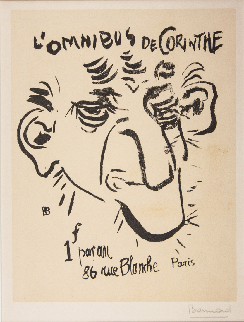 Litografia. mm 250x192. Foglio: mm 320x250. In basso a destra a matita: "Bonnard". La stampa fu offerta come dono nel periodico effimero "L'Omnibus de Corinthe" diretto da Fernand Clerget, uscito per soli sei numeri dal 15 ottobre 1896 al 15 gennaio 1898. Ful allegata al numero del 15 aprile 1897 ma solo nella tiratura di lusso. Rara.