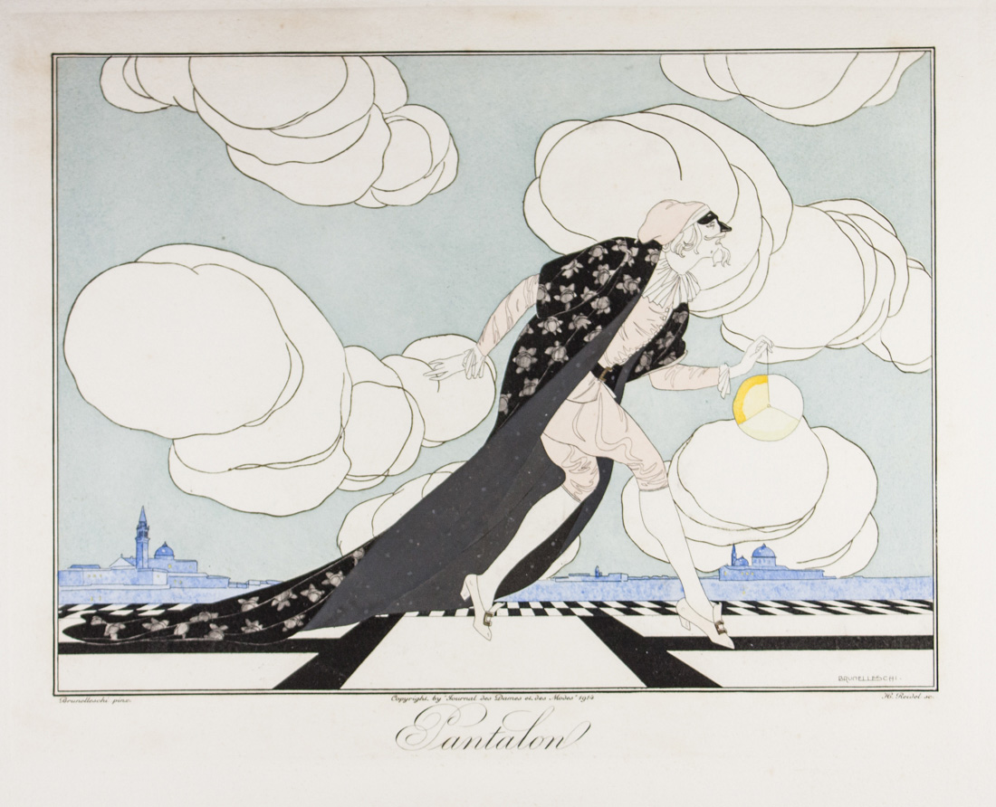 Incisione colorata a pochoir. mm 260x330. Foglio: mm 370x475. Titolo in basso a centro. Ai lati: "Brunelleschi pinx. - H. Reidel sc.". Copyright by "Journal des Dame et de Modes" 1914. Dalla serie "Les Masques et les Personnages de la Comédie Italienne", Paris aux bureau du Journal des Dame et de Modes, 1914. Uno dei più importanti e precoci album dello stile Art Déco.