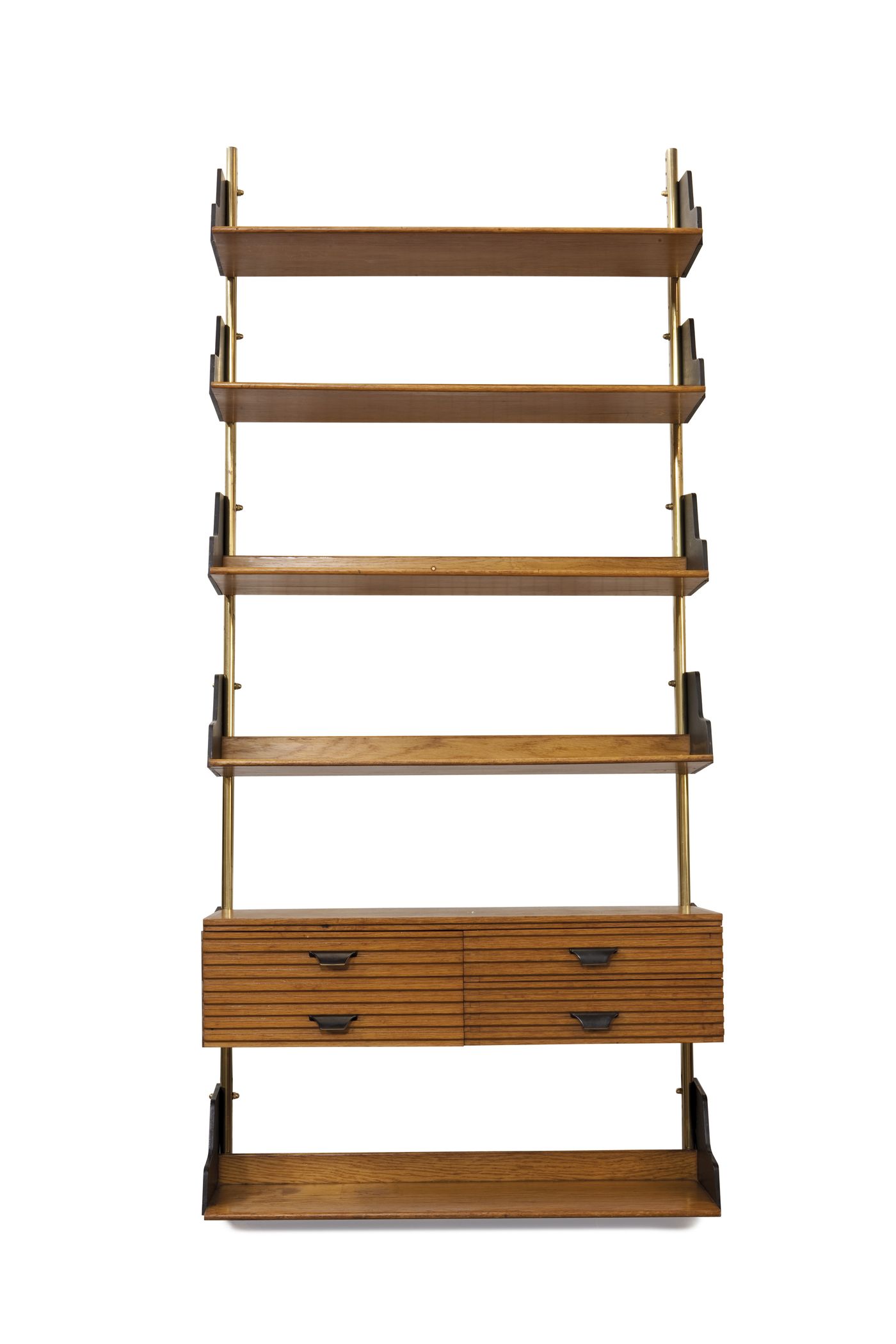LIBRERIA Libreria pensile in ottone zapponato con piani in rovere, supporti laterali in legno laccato nero. Elemento contenitore a uno sportello e due cassetti con fronte godronato. cm 180x80x34