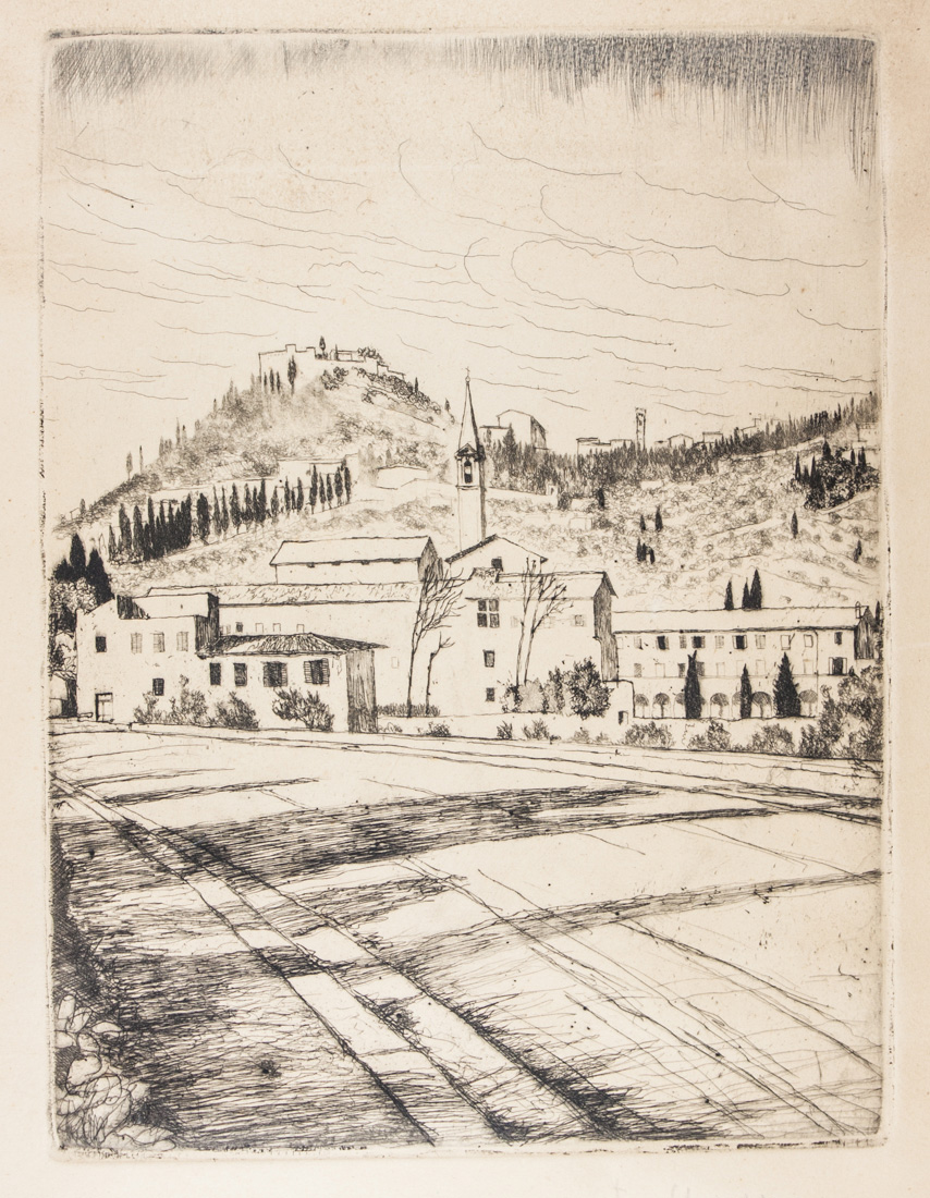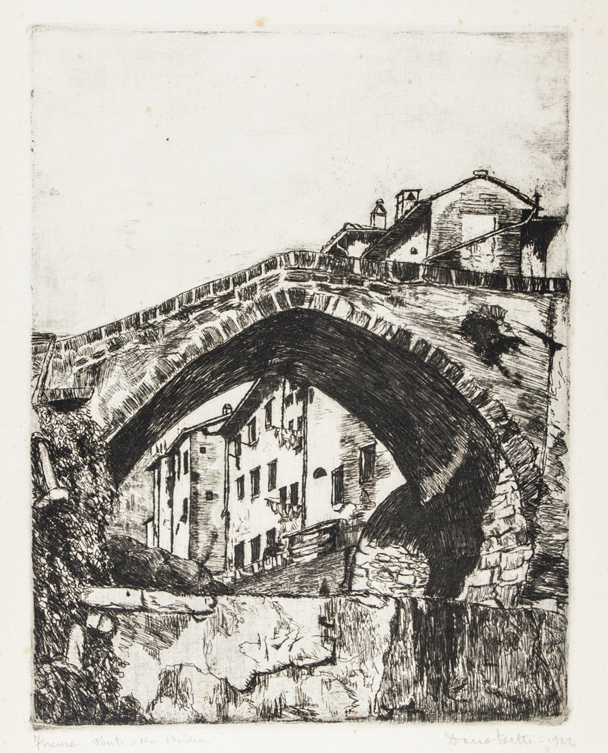 1) Ponte a S. Trinita. Acquaforte. mm 313x223. Foglio: mm 493x338. Titolata e firmata a matita. 2) Fiesole. Acquaforte. mm 322x243. Foglio: mm 432x313. Firmata a matita. Prove di stampa fuori numerazione dalla serie Firenze, costituita da 14 acqueforti (più una di frontespizio) e pubblicata dall'Editore Aldo Gonnelli nel 1947. La tiratura si componeva di 75 esemplari su carta China da 1 a 75 e 125 esemplari su carta avorio, da 76 a 150. Si aggiunge: Dario Betti (Firenze 1891-1987). Firenze. Ponte alla Badia. 1922. Acquaforte. mm 282x217. Foglio: mm 400x300. Titolata, firmata e datata a matita.(3)