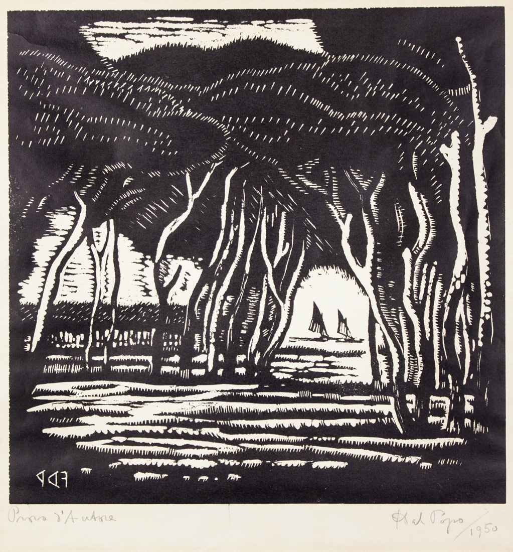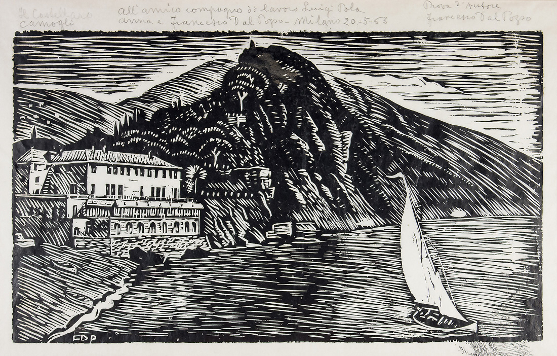 1) Scena orientale. Xilografia su velina. mm 260x365. Foglio: mm 385x480. In basso a matita: "prova d'autore - F. Dal Pozzo". Il Castellaro Camogli. Xilografia su velina. mm 200x335. Foglio: 270x445. Titolata, dedicata in data 1963, annotata "prova d'autore" e firmata in alto a matita. 3) Pineta su mare. Xilografia su velina. mm 300x300. Foglio: mm 470x335.In basso a matita: "prova d'autore - F. Dal Pozzo/1950".(3)