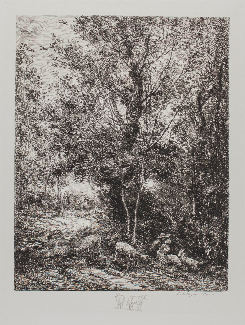 Acquaforte. mm 282x220. Foglio: mm 440x305. Delteil 122. IV stato/7, con remarque, avanti la lettera. Firmato e datato "Daubigny 1874" in basso a sinistra. SI AGGIUNGE: Id., Les vendanges (Souvenir du Morvan). 1875. Acquaforte e puntasecca. mm 235x365. Foglio: mm 342x515. Delteil 117. III stato/5 con indicazione di tipografo e editore. Firmato in basso a sinsitra nella lastra, titolo e indicazioni editoriali al centro in basso, a destra: "Imp. Delatre, Rue s.t Jacques 303, Paris". Numerato in alto a destra "161". Tiratura per la Societé des Aquafortistes. (2)