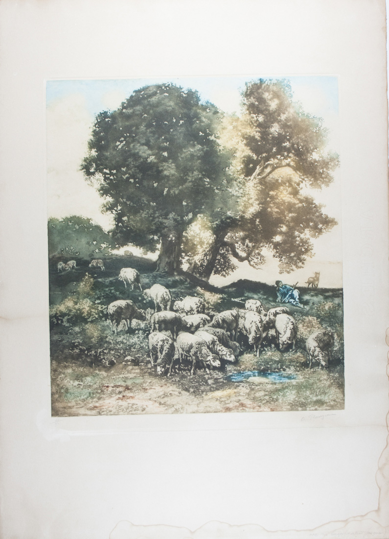 Acquatinta a colori. mm 500x645. foglio: mm 625x900. Firmata a matita e numerata "113.300". mm Si aggiunge: Amédée Buffet. Paesaggio con scalinata. Acquatinta a colori. mm 438x605. Foglio: mm 636x900. Firmata a matita. A. Plangeau. Paesaggio con gregge. Acquatinta a colori, mm 574x478. Foglio: mm 880x640. Firmata a matita e numerata "68/390". (3)