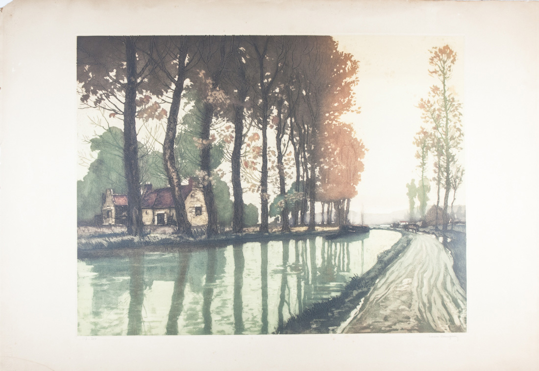 Louis-Etienne Dauphin Paesaggio con canale. Acquatinta a colori. mm...