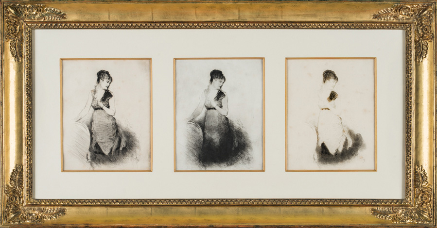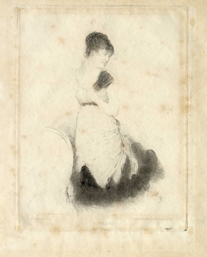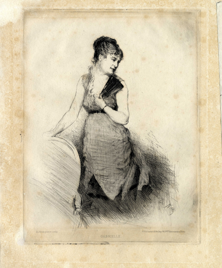 3 prove uniche di stampa provenienti dallo studio dell'artista. 1) Acquaforte e puntasecca. mm 245x182. Foglio: mm 330x230. Fiorani-Dinoia 15. Firmata in basso a destra nella lastra. Iscrizioni tipografiche in basso: "De Nittis pinxit et scupl. - Gabrielle - V.ve A. Cadart Edit. Imp. 56, B.ard Haussmann Paris". Esemplare corrispondente al terzo stato (su tre) ma con segni della puntasecca più intensi rispetto a quello riprodotto in Fiorani-Dinoia, p. 134. 2) Acquaforte e puntasecca. mm 245x182. Foglio: mm 280x225. Firmata in basso a destra nella lastra. Iscrizioni tipografiche in basso: "De Nittis pinxit et scupl. - Gabrielle - V.ve A. Cadart Edit. Imp. 56, B.ard Haussmann Paris". Esemplare corrispondente al terzo stato ma con forte effetto di velatura quasi monotipata nella parte inferiore della figura rispetto a quello riprodotto in Fiorani-Dinoia, p. 134. 3) Acquaforte. mm 245x182. Foglio: mm 340x255. Firmata in basso a destra nella lastra. Iscrizioni tipografiche in basso: "De Nittis pinxit et scupl. - Gabrielle - V.ve A. Cadart Edit. Imp. 56, B.ard Haussmann Paris". Questo ultimo esemplare presenta la figura solo in parte delineata ed è privo dei ritocchi a puntasecca, quindi dovrebbe trattarsi di un primo stato assoluto non conosciuto da Fiorani-Dinoia. Tuttavia stranamente reca le iscizioni tipografiche assenti nel primo stato finora conosciuto (Fiorani-Dinoia. p. 132) e che compaiono nel secondo stato secondo Fiorani-Dinoia (p. 133).(3)