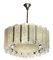 BAROVIER & TOSO Lampadario in metallo cromato. Diffusore centrale e diciassette elementi prismatici in vetro rugiadoso. 1965 circa. h cm 94 diam cm 50