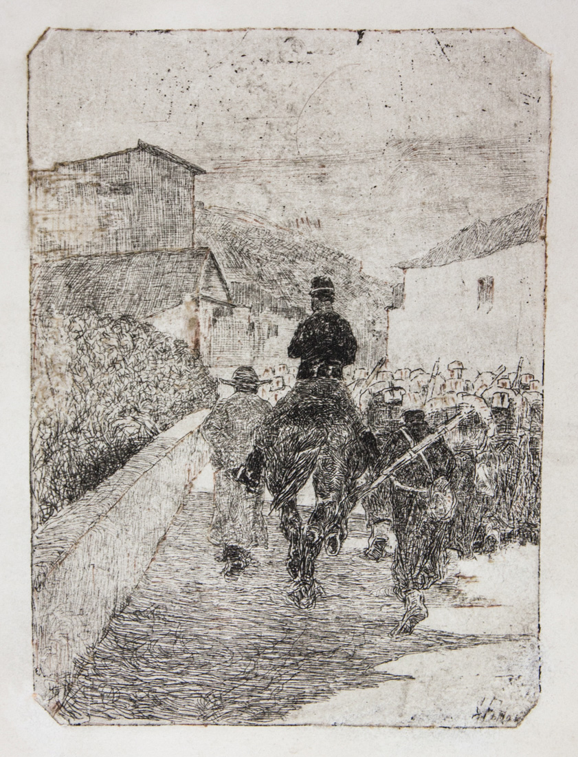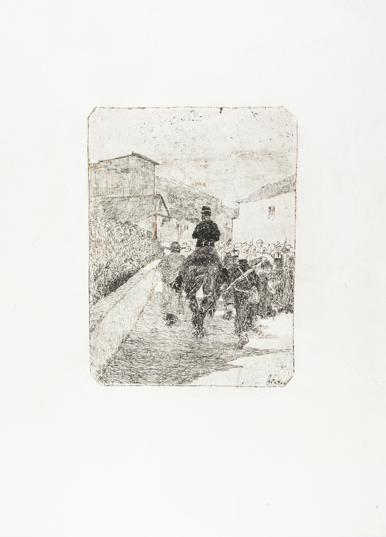 Acquaforte su zinco. mm 198x144. Foglio: mm 425x280. Baboni-Malesci CXLV. Firmata nella lastra in basso a destra. Esemplare in tiratura coeva impresso su carta bianca. Il soggetto dell'acquaforte, un gruppo di fanti osservati di spalle e affiancati da un ufficiale a cavallo e da un curato che si accingono ad entrare in un borgo, appare anche nel dipinto databile al 1880 circa intitolato Fanteria in marcia. L'esecuzione della lastra probabilmente risale a quello stesso periodo. La lastra è conservata al Gabinetto disegni e stampe degli Uffizi (n 143 M).