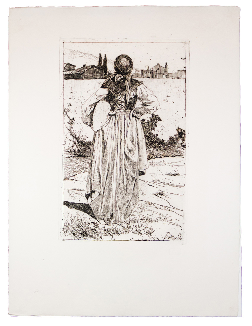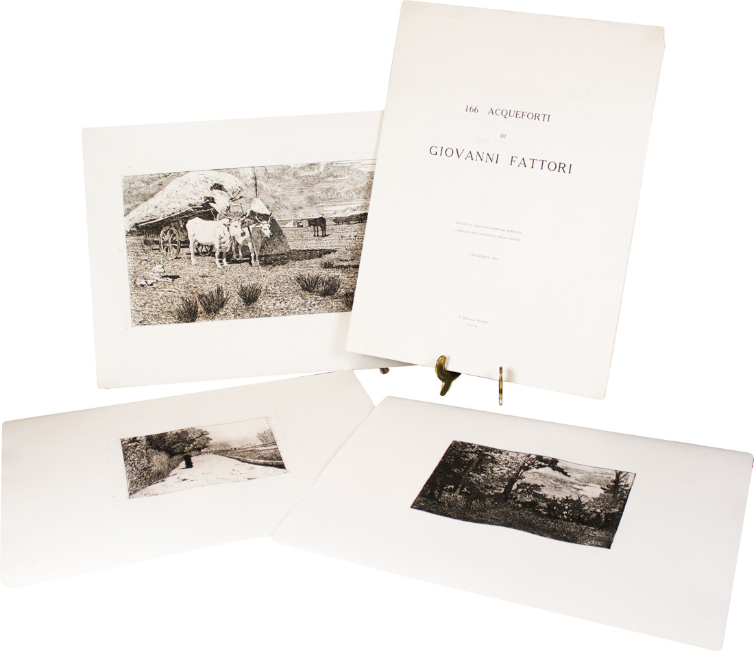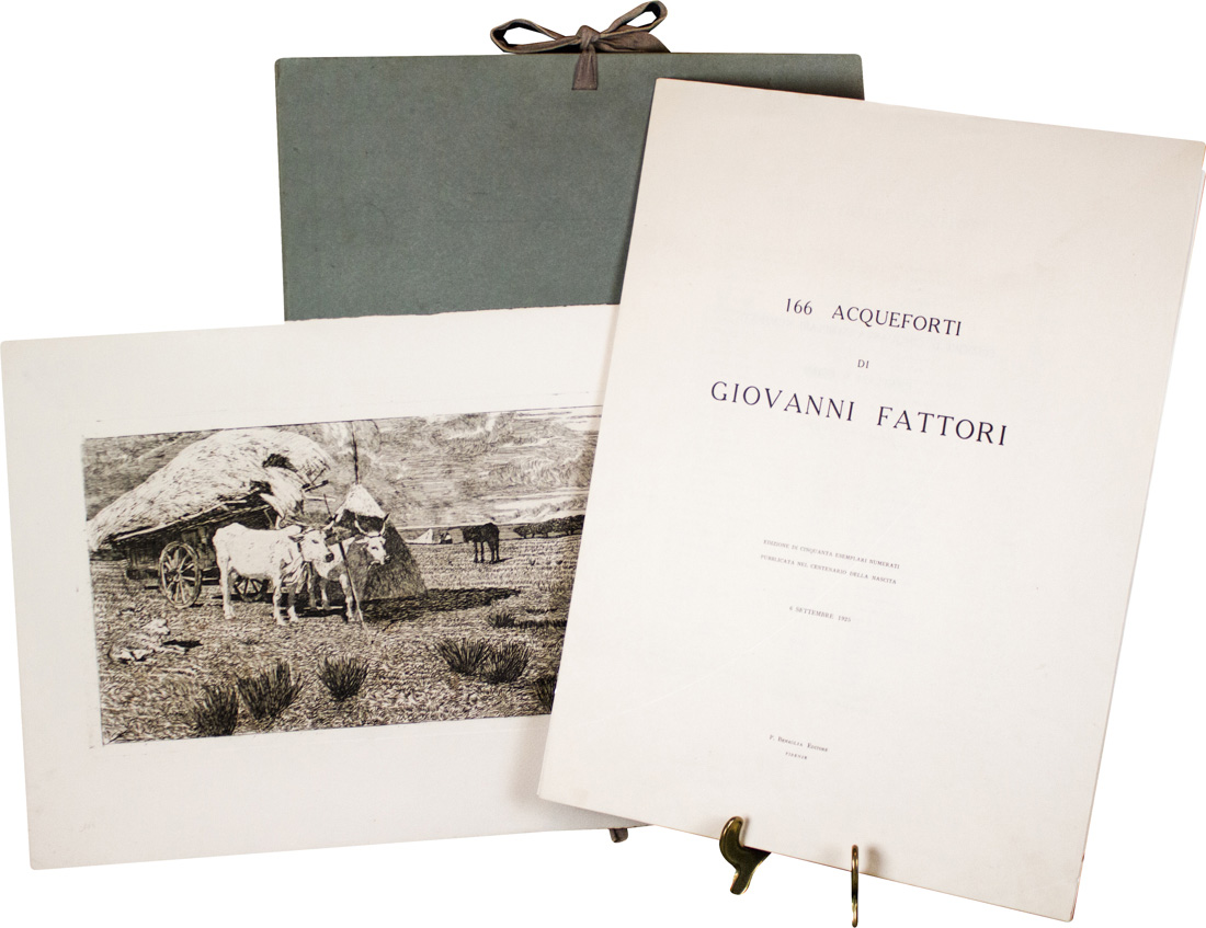 Cartella editoriale a fogli sciolti (mm 518x380). Contiene 8 carte con frontespizio, tiratura, elenco delle opere, introduzione e 166 acqueforti corredate di velina protettiva. Edizione di cinquanta esemplari numerati e firmati da Giovanni Poggi, curatore dell'edizione e autore del saggio introduttivo. Es. n. 36/50. Cartella editoriale a tre lembi in cartonato color carta zucchero con riproduzione della firma del Fattori al piatto anteriore. Chiusa da legacci di stoffa. Applicato al piatto anteriore un catalogo: La grafica di Giovanni Fattori. Pisa: Vallerini, s.d.Raccolta completa ed omogenea delle 166 acqueforti di Giovanni Fattori pubblicata a Firenze il 6 settembre del 1925 dall'editore Benaglia in occasione del centenario della nascita dell'artista.L'edizione, comunemente nota come “tiratura del centenario”, fu realizzata grazie al lascito allo Stato Italiano (con deposito presso il Gabinetto Disegni e Stampe degli Uffizi) delle 164 lastre originali da parte di Giovanni Malesci, allievo ed erede universale dell'artista. Le incisioni furono stampate su fogli di carta vergellata di mm 384x507 con filigrana “Corona merlata su scritta UMBRIA/ITALIA” e contromarca “Lettere CP inscritte in doppio ovale” e ciascuna reca in basso il timbro a secco “Centenario/Gio.Fattori/1925”. La serie delle 166 acqueforti copre la quasi totalità dell'opera incisa di Fattori (che si compone di un totale di 174 lastre conosciute); esse furono selezionate da Giovanni Malesci che, delle lastre in suo possesso, ne escluse 12 corrose e anche 7 facce delle 164 lastre utilizzate. La serie completa è da considerarsi molto rara per il ristretto numero di copie rimaste complete dal momento che molti singoli fogli provenienti da questa edizione sono stati smembrati e vengono comunemente reperiti sciolti.