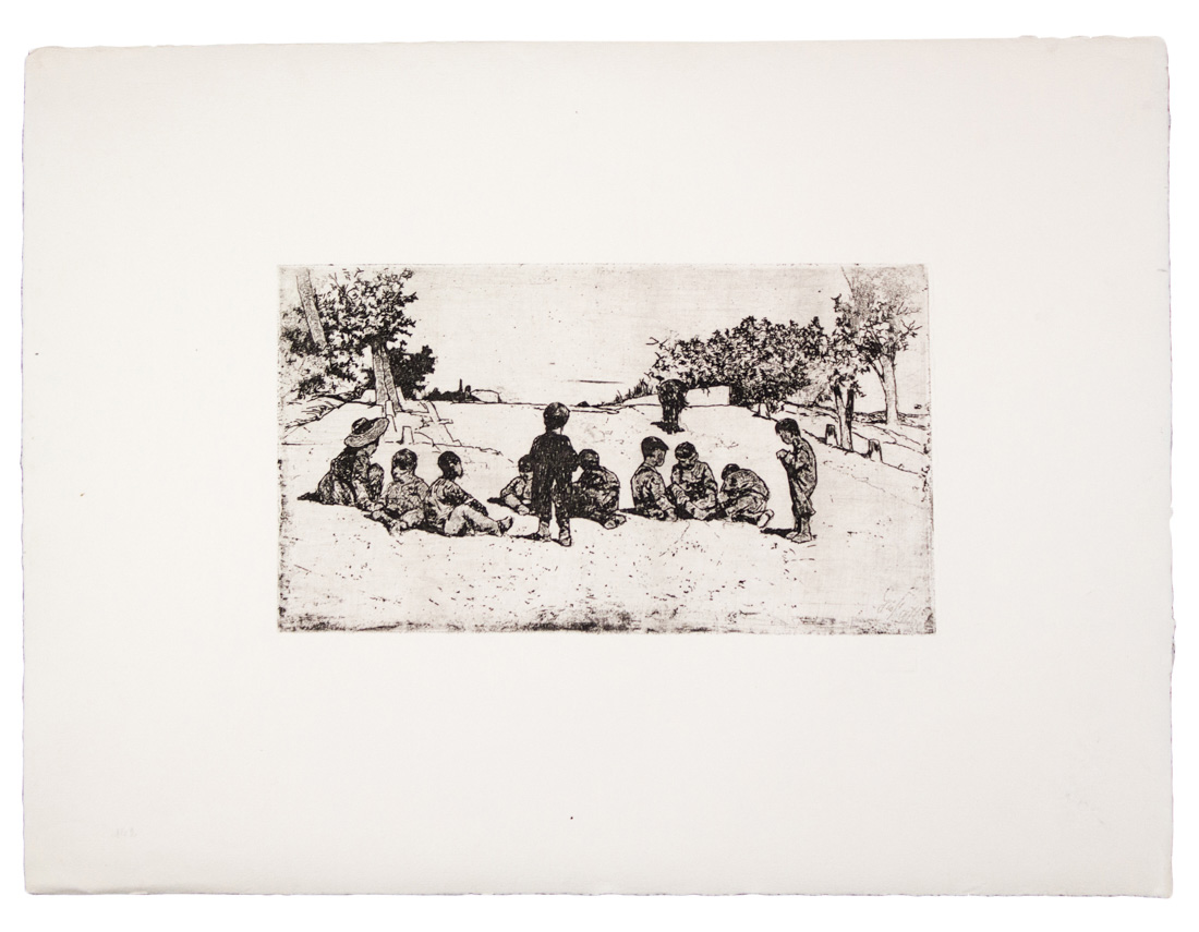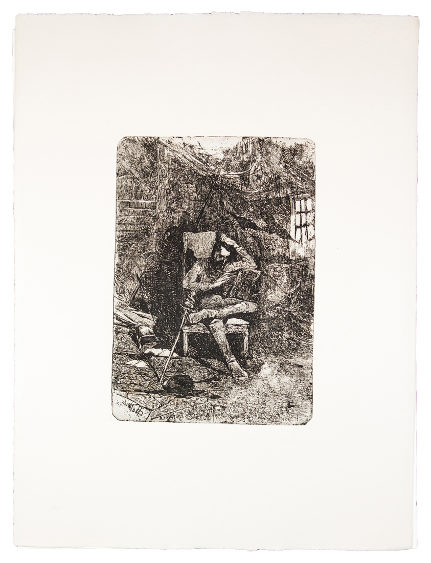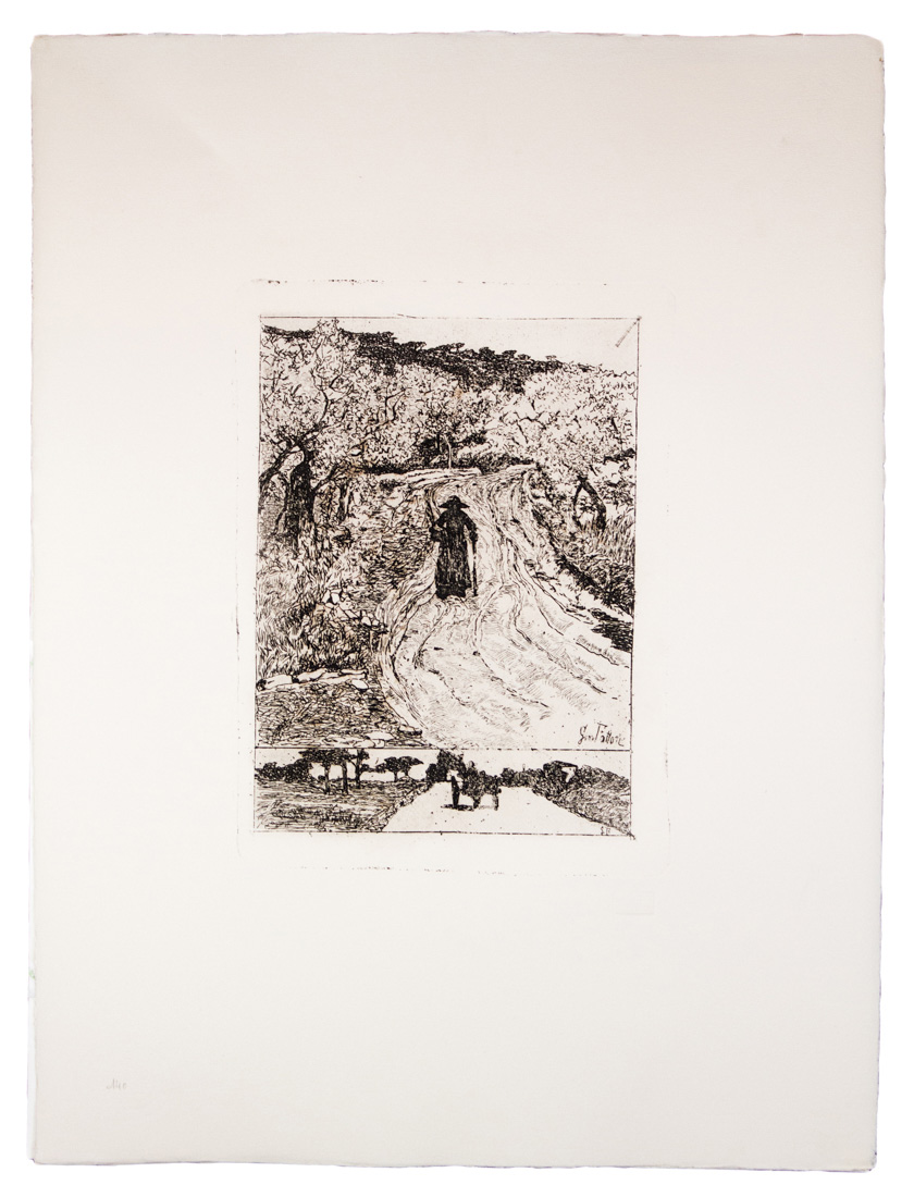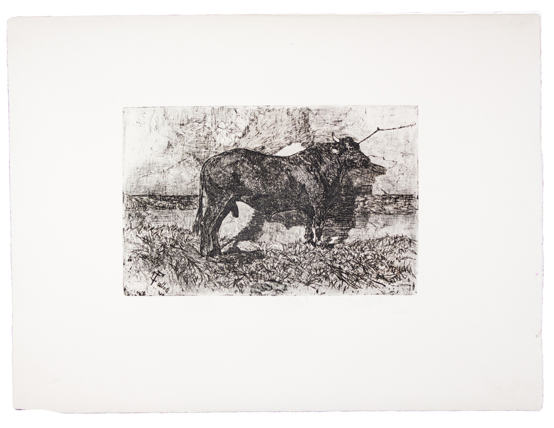 Cartella editoriale a fogli sciolti (mm 518x380). Contiene 8 carte con frontespizio, tiratura, elenco delle opere, introduzione e 166 acqueforti corredate di velina protettiva. Edizione di cinquanta esemplari numerati e firmati da Giovanni Poggi, curatore dell'edizione e autore del saggio introduttivo. Es. n. 36/50. Cartella editoriale a tre lembi in cartonato color carta zucchero con riproduzione della firma del Fattori al piatto anteriore. Chiusa da legacci di stoffa. Applicato al piatto anteriore un catalogo: La grafica di Giovanni Fattori. Pisa: Vallerini, s.d.Raccolta completa ed omogenea delle 166 acqueforti di Giovanni Fattori pubblicata a Firenze il 6 settembre del 1925 dall'editore Benaglia in occasione del centenario della nascita dell'artista.L'edizione, comunemente nota come “tiratura del centenario”, fu realizzata grazie al lascito allo Stato Italiano (con deposito presso il Gabinetto Disegni e Stampe degli Uffizi) delle 164 lastre originali da parte di Giovanni Malesci, allievo ed erede universale dell'artista. Le incisioni furono stampate su fogli di carta vergellata di mm 384x507 con filigrana “Corona merlata su scritta UMBRIA/ITALIA” e contromarca “Lettere CP inscritte in doppio ovale” e ciascuna reca in basso il timbro a secco “Centenario/Gio.Fattori/1925”. La serie delle 166 acqueforti copre la quasi totalità dell'opera incisa di Fattori (che si compone di un totale di 174 lastre conosciute); esse furono selezionate da Giovanni Malesci che, delle lastre in suo possesso, ne escluse 12 corrose e anche 7 facce delle 164 lastre utilizzate. La serie completa è da considerarsi molto rara per il ristretto numero di copie rimaste complete dal momento che molti singoli fogli provenienti da questa edizione sono stati smembrati e vengono comunemente reperiti sciolti.