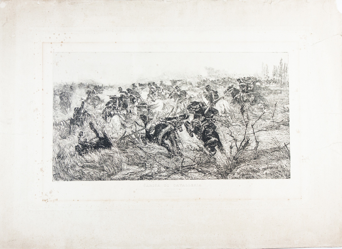 Acquaforte su rame. mm 359x562. Foglio: mm 490x675. Bonagura, 22. Baboni-Malesci, CLXXVIII. Timpanaro, 11. Iscrizioni tipografiche: in basso a sinistra: "G. Fattori", in basso al centro: "Carica di cavalleria/Ricordo ai Componenti la Società delle Belle Arti in Firenze/Anno Sociale 1889/ Calcografia G. Castaldi".  Con sotto timbro a secco della Società. Realizzata per la Società di Incoraggiamento delle Belle Arti di Firenze e tratta da un analogo dipinto del 1872, le prime prove di stampa senza le scritte tipografiche furono impresse già nel 1884 dallo stampatore Frassinetti di Firenze. Nel 1889 venne invece eseguita la tiratura ufficiale limitata a 50 esemplari eseguita dal calcografo Gastaldi di Torino a cui appartiene il presente esemplare.