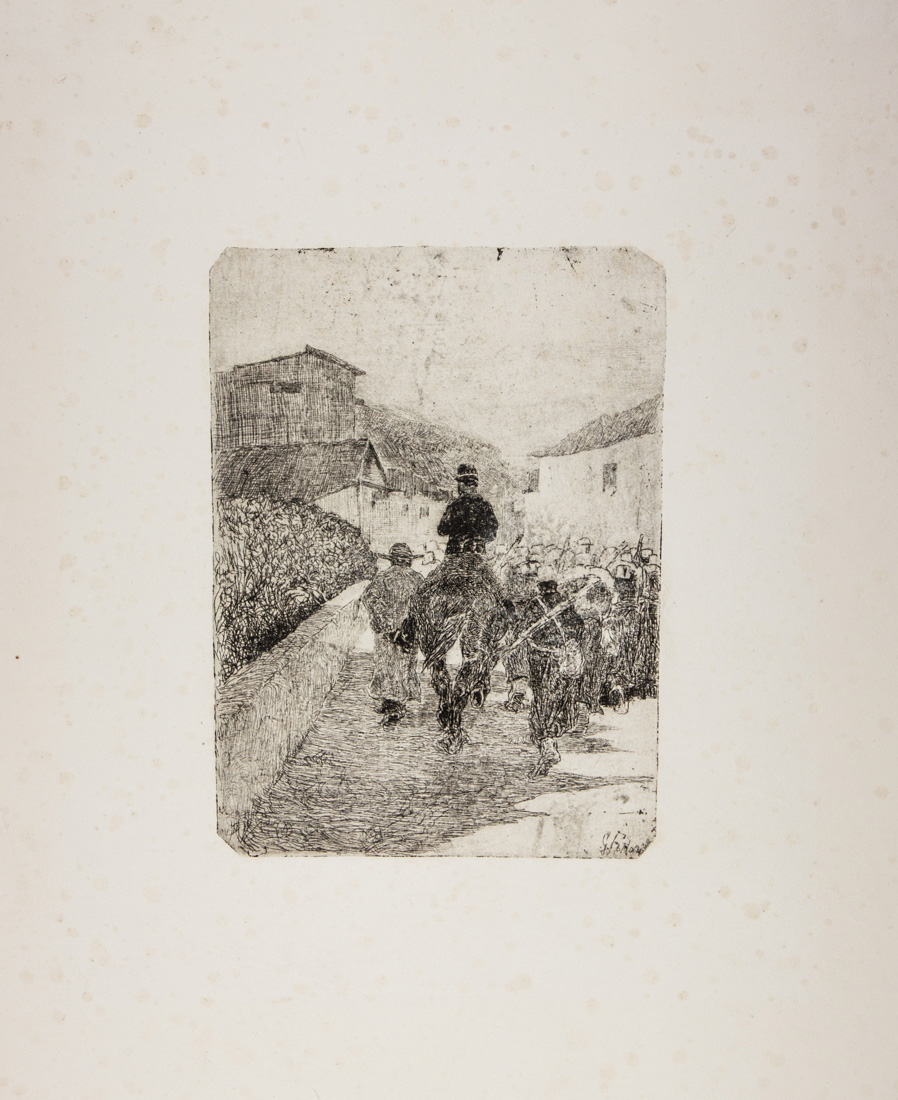 Acquaforte su zinco. mm 198x144. Foglio: mm 360x295. Baboni-Malesci CXLV. Firmata nella lastra in basso a destra. Esemplare in tiratura coeva impresso su carta bianca. Il soggetto dell'acquaforte, un gruppo di fanti osservati di spalle e affiancati da un ufficiale a cavallo e da un curato che si accingono ad entrare in un borgo, appare anche nel dipinto databile al 1880 circa intitolato Fanteria in marcia. L'esecuzione della lastra probabilmente risale a quello stesso periodo. La lastra è conservata al Gabinetto disegni e stampe degli Uffizi (n 143 M).