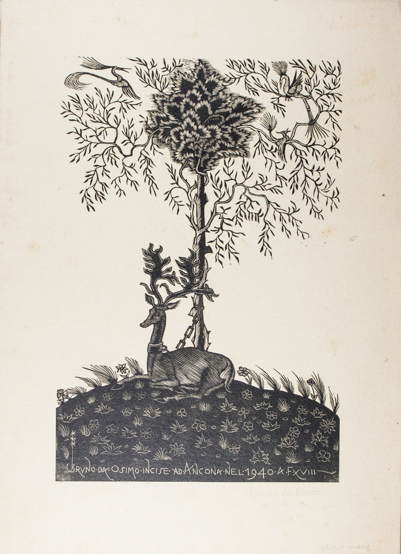 1) San Giorgio. 1940. Xilografia su velina applicata su cartoncino. mm 300x200. Foglio: mm 398x302. Iscrizione in basso: "Bruno da Osimo incise ad Ancona nel marzo 1940 XVIII per il concorso Interpretazione dall'antico". Firmata a matita in basso a destra. 2) Cervo incatenato a un albero. Xilografia su velina applicata su cartoncino. mm 300x200. Foglio: mm 400x290. Iscrizione in basso: "Bruno da Osimo incise ad Ancona nel 1940 A. F. XVIII". Firmata a matita in basso a destra, sotto "copia a mano". (2)