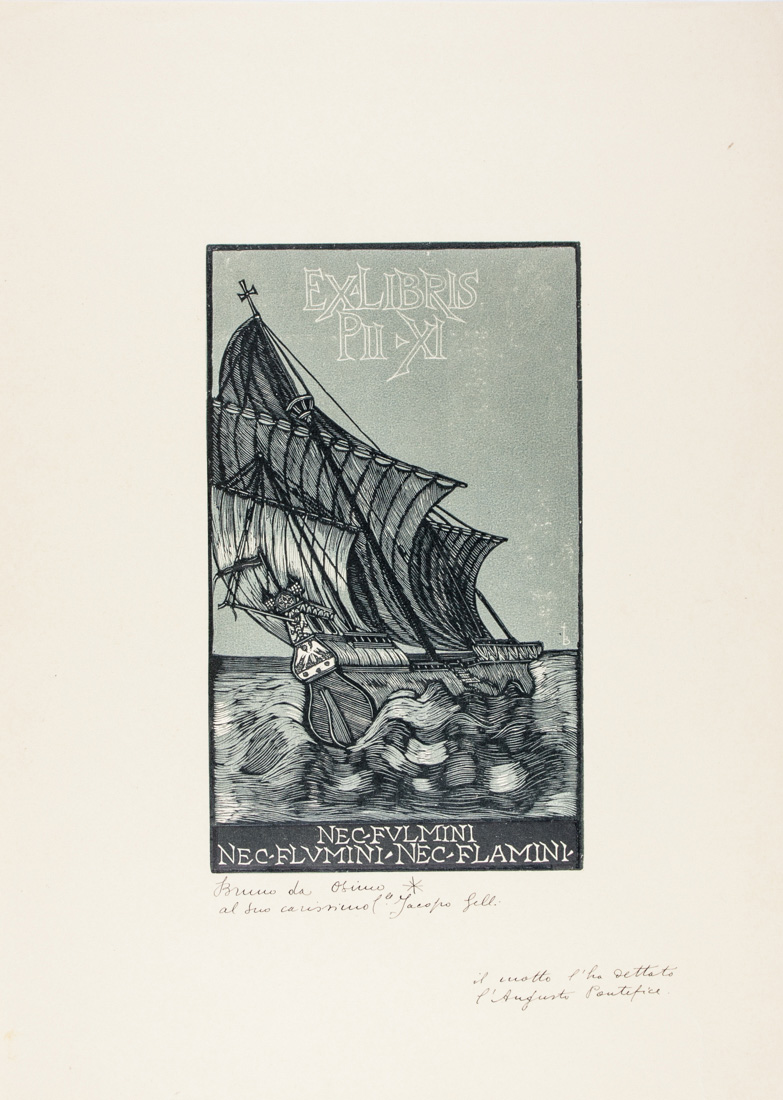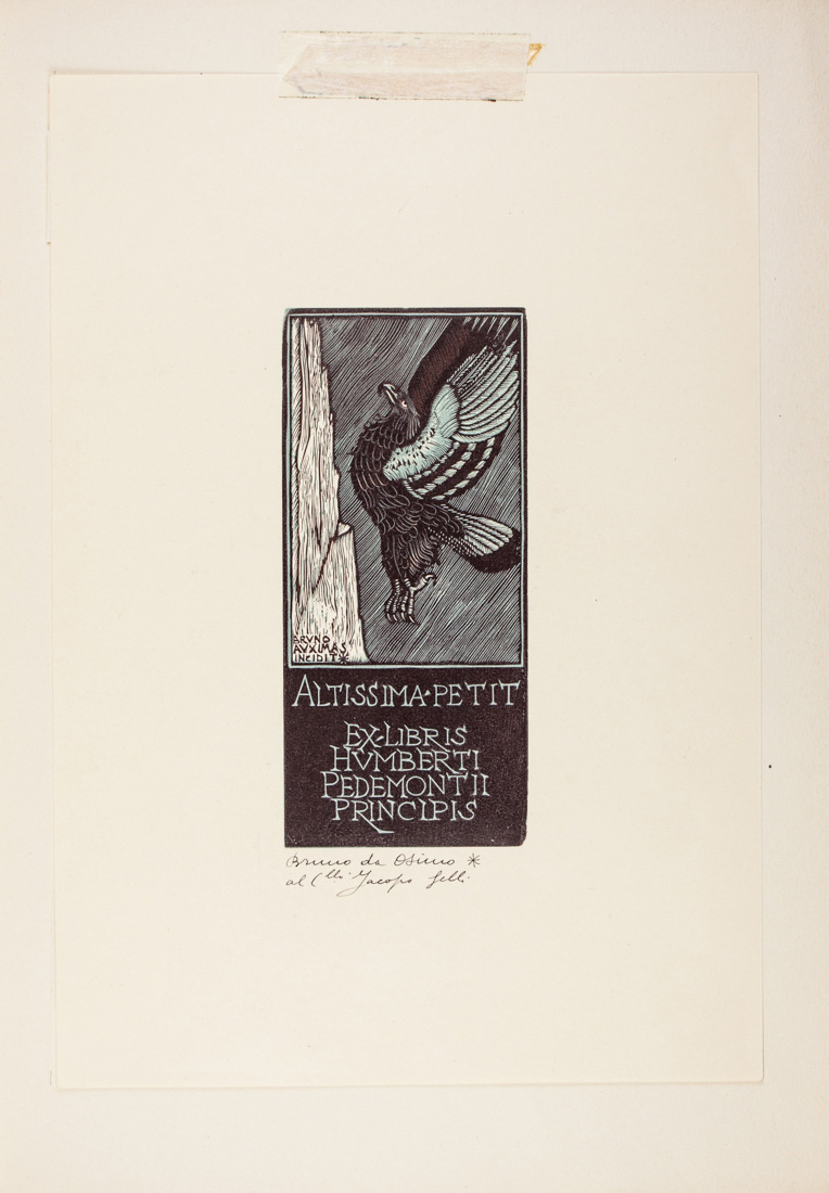 Xilo grafia. mm 380x478. Foglio: mm 475x660. Firmata nella matrice in basso a sinistra: "Bruno Auximas ospes inc. a. s. MCML". In basso testo in latino di Alexander Meckam. Dedicata a matita in basso a sinistra: "Alla Cerosa di Calci/l'ospite Bruno da Osimo". Si aggiungono 2 ex libris dedicati a Jacopo Gelli: ex libris per Pio XI, xilografia. mm 185x110. Foglio: mm 330x240. Motto: “Nec fulmini, nec flamini”. Firma e dedica a penna “al suo carissimo Jacopo Gelli”; ex libris per il principe Umberto di Savoia, xilografia. mm 155x70. Foglio: mm 290x205. Firma e dedica a penna “Al C.llo Jacopo Gelli”. Fermato in alto con nastro adesivo a passe-partout. Entrambi recano al verso il timbro della Collezione Alianello.(3)