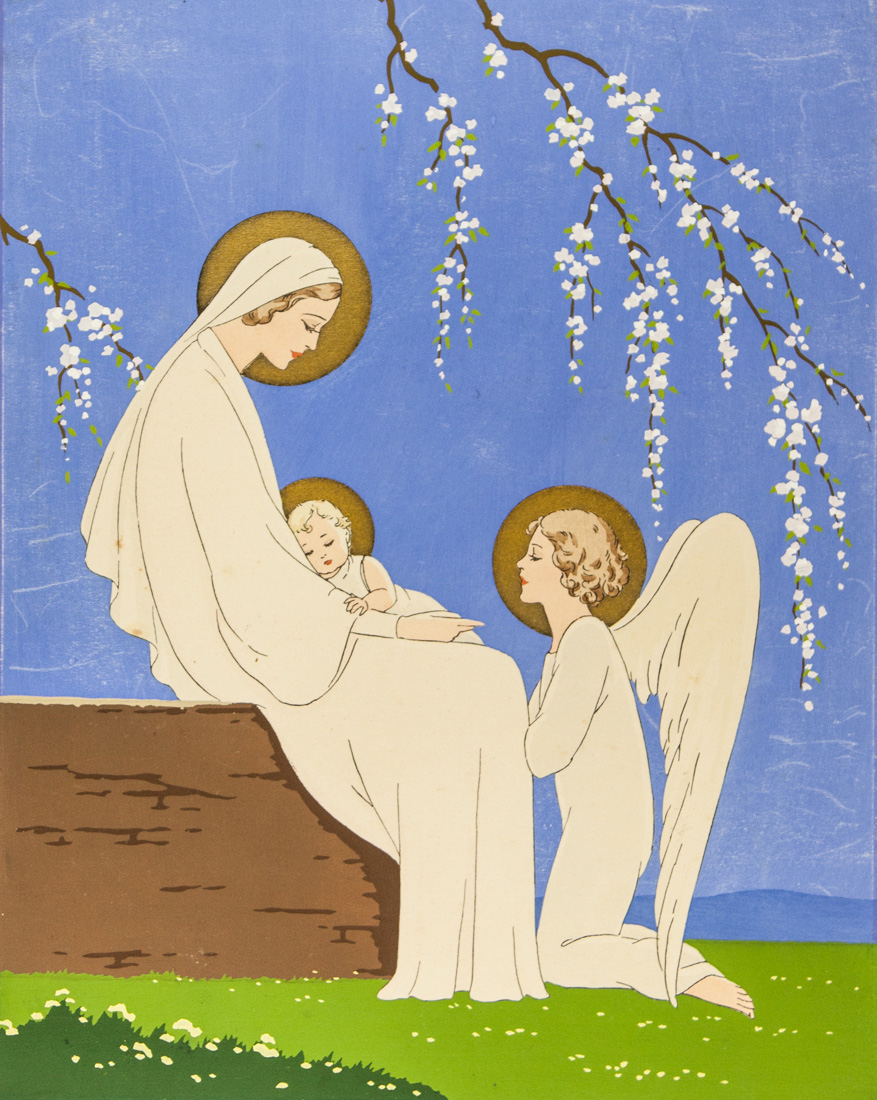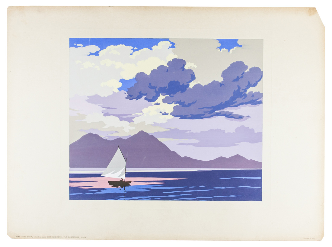Incisione colorata a pochoir. mm 300x240. Stampato al retro "G.M. Sacra Ars Nova. Dipinta a mano. n. 13. Si aggiunge: Id. Marina. Incisione colorata a pochoir. mm 270x315. Foglio: 350x480. Stampato in basso a sinistra: "G. M. Ars Nova (dipinta a mano) Edizioni d'Arte. Prof. G. Meschini, n. 433". (2)